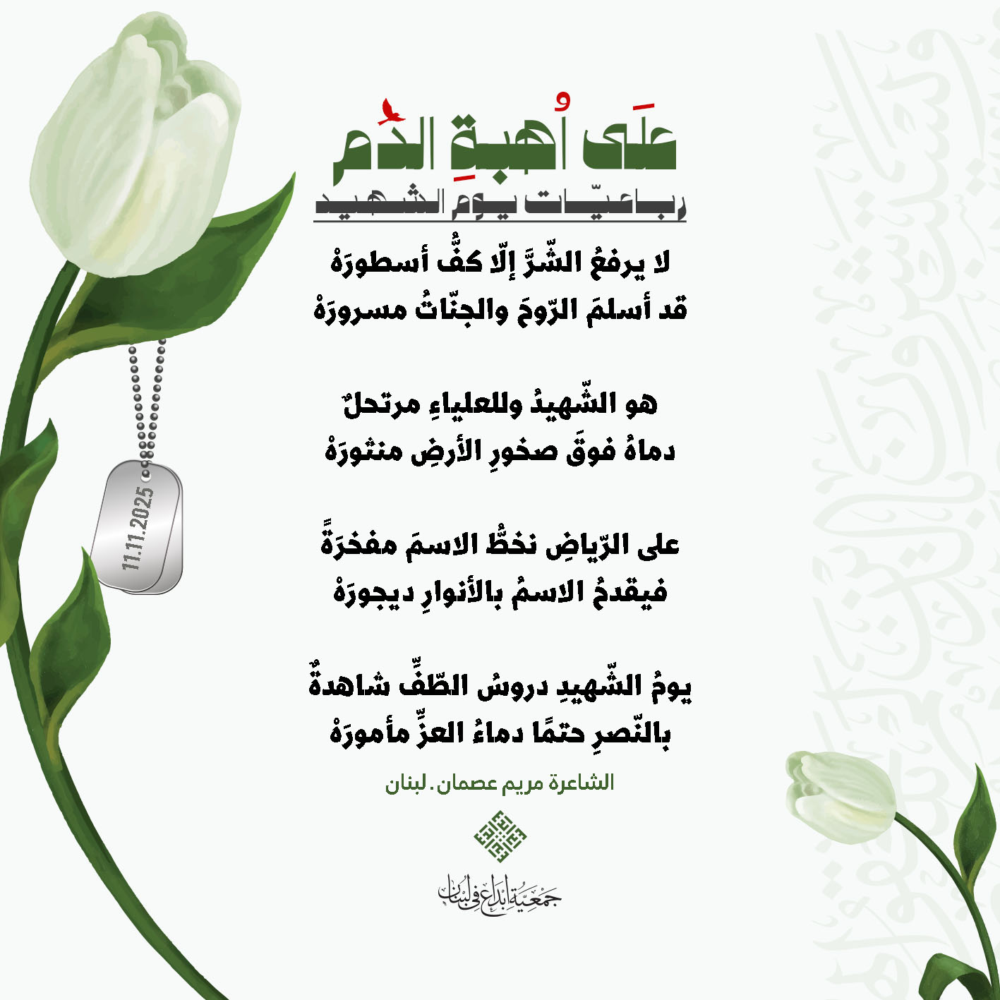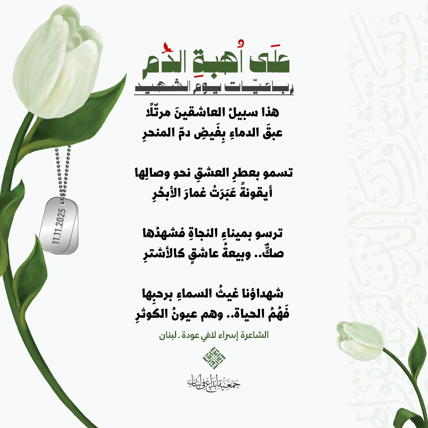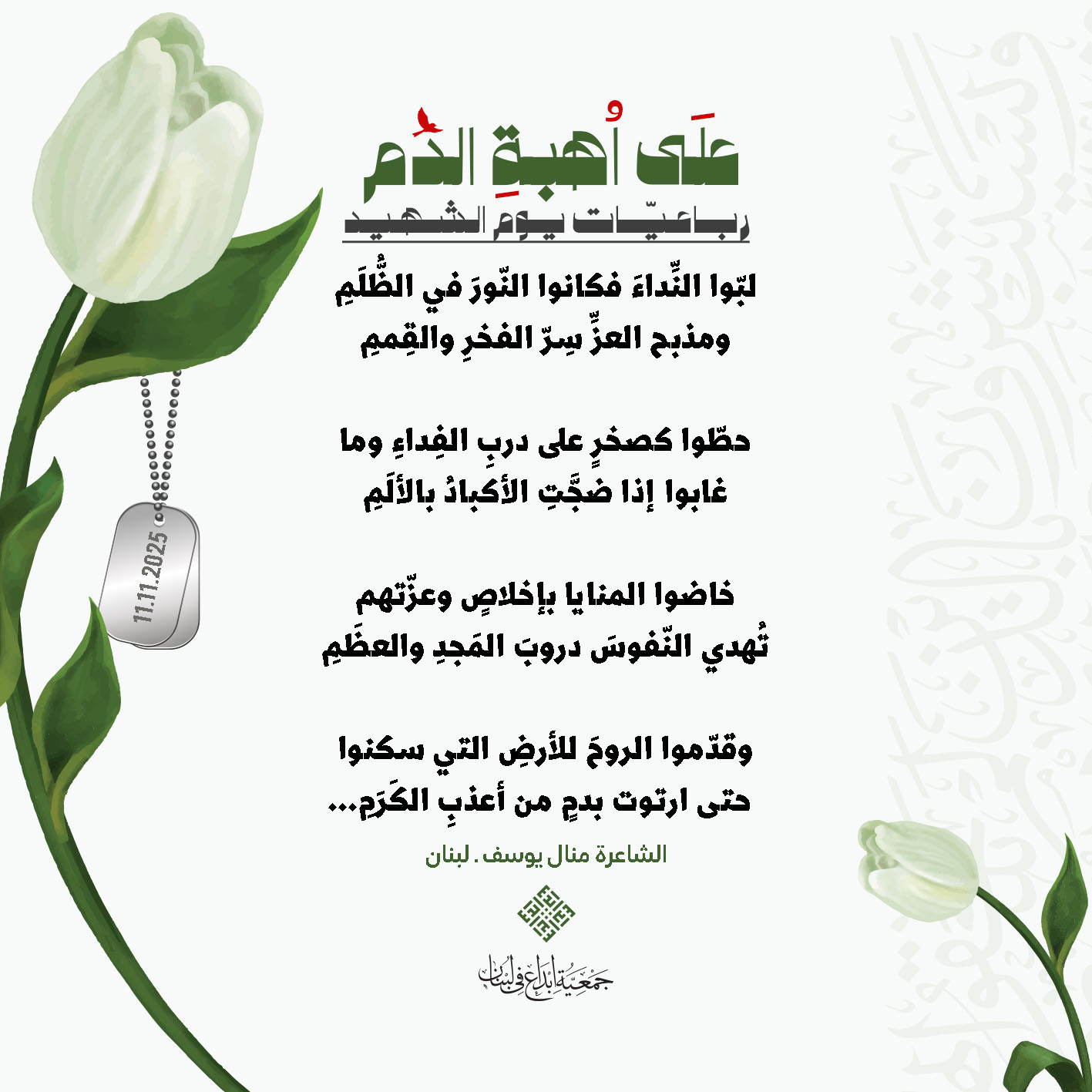 #على_اُهبة_الدم رباعيات #إبداع الشعرية #يوم_الشهيد المشاركون في الرباعيات : 1. الشاعرة هناء إبراهيم ـ لبنان 2. الشاعرة نور مصطفى لمع ـ لبنان 3. الشاعرة نبال رعد ـ لبنان 4. الشاعرة ناديا الحقاني ـ لبنان 5. الشاعرة منال يوسف ـ لبنان 6. الشاعرة مريم عصمان ـ لبنان 7. الشاعرة كوثر حجازي ـ لبنان 8. الشاعرة فاطمة السحمراني ـ لبنان 9. الشاعرة سكينة سويدان ـ لبنان 10. الشاعرة سارة اليتامى ـ لبنان 11. الشاعرة زينب الموسوي ـ لبنان 12. الشاعرة إسراء لافي عودة ـ لبنان 13. الشاعر مهدي البزّال ـ لبنان 14. الشاعر محمود شور ـ لبنان 15. الشاعر محمد ال عبد الرسول السماوي ـ العراق 16. الشاعر مثيل الزيدي ـ العراق 17. الشاعر فضل سرور ـ لبنان 18. الشاعر علي درويش ـ لبنان 19. الشاعر علي إسماعيل شاهين ـ لبنان 20. الشاعر عبد الله أبو مهدي 21. الشاعر عباس حمدان ـ لبنان 22. الشاعر أمير موسى السماوي ـ العراق 23. الشاعر أحمد غالب سرحان ـ لبنان 24. الشاعر أحمد علي أحمد ـ لبنان 25. الشاعر السيد الحتاني ـ لبنان 10/11/2025