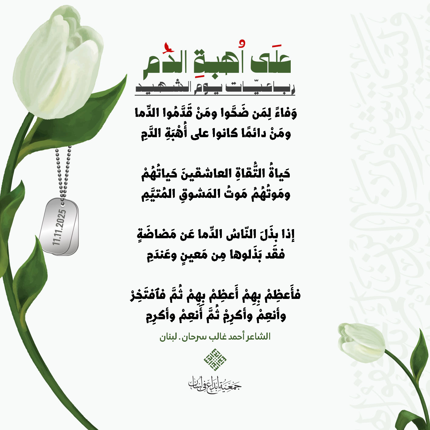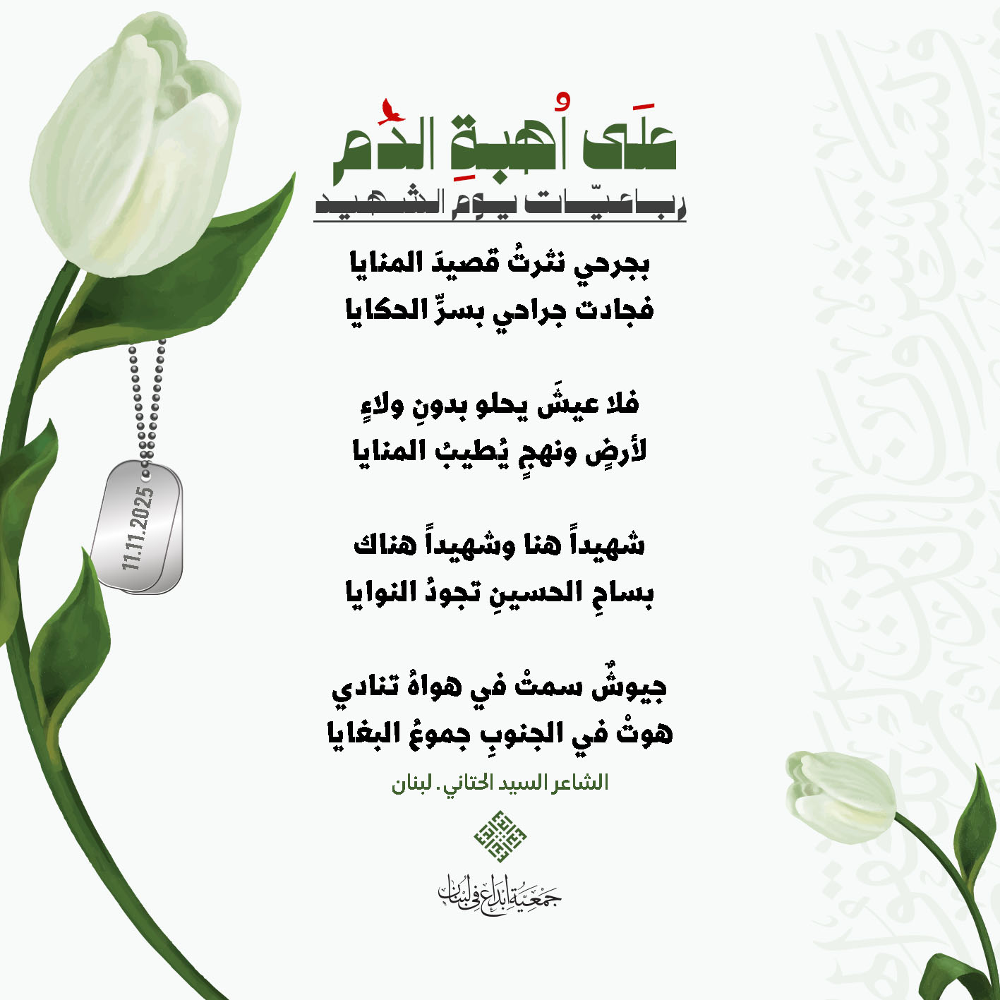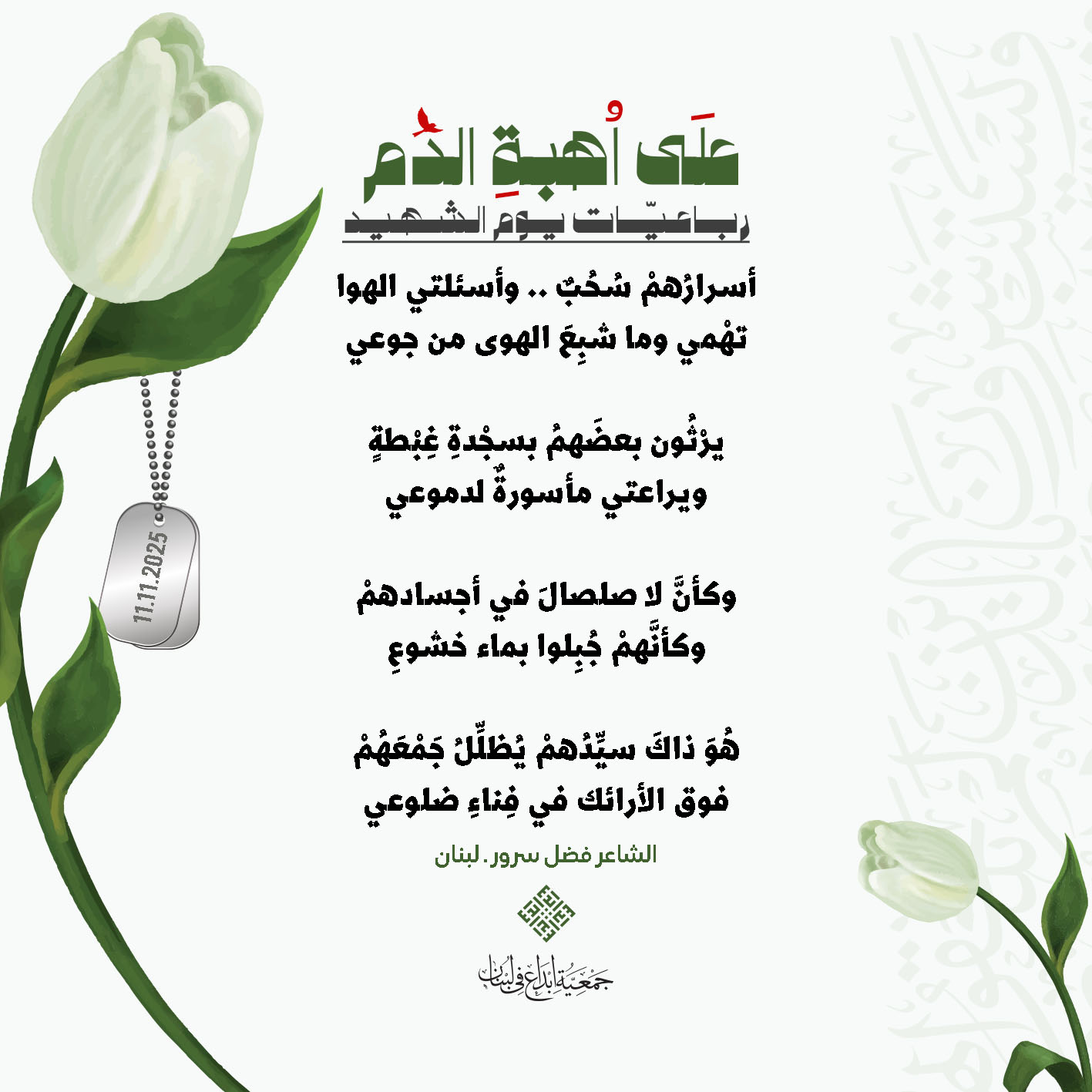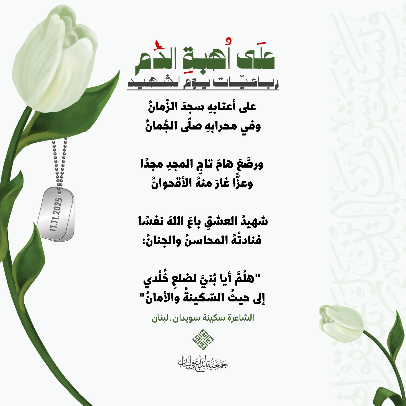 #على_اُهبة_الدم رباعيات #إبداع الشعرية #يوم_الشهيد المشاركون في الرباعيات : 1. الشاعرة هناء إبراهيم ـ لبنان 2. الشاعرة نور مصطفى لمع ـ لبنان 3. الشاعرة نبال رعد ـ لبنان 4. الشاعرة ناديا الحقاني ـ لبنان 5. الشاعرة منال يوسف ـ لبنان 6. الشاعرة مريم عصمان ـ لبنان 7. الشاعرة كوثر حجازي ـ لبنان 8. الشاعرة فاطمة السحمراني ـ لبنان 9. الشاعرة سكينة سويدان ـ لبنان 10. الشاعرة سارة اليتامى ـ لبنان 11. الشاعرة زينب الموسوي ـ لبنان 12. الشاعرة إسراء لافي عودة ـ لبنان 13. الشاعر مهدي البزّال ـ لبنان 14. الشاعر محمود شور ـ لبنان 15. الشاعر محمد ال عبد الرسول السماوي ـ العراق 16. الشاعر مثيل الزيدي ـ العراق 17. الشاعر فضل سرور ـ لبنان 18. الشاعر علي درويش ـ لبنان 19. الشاعر علي إسماعيل شاهين ـ لبنان 20. الشاعر عبد الله أبو مهدي 21. الشاعر عباس حمدان ـ لبنان 22. الشاعر أمير موسى السماوي ـ العراق 23. الشاعر أحمد غالب سرحان ـ لبنان 24. الشاعر أحمد علي أحمد ـ لبنان 25. الشاعر السيد الحتاني ـ لبنان 10/11/2025