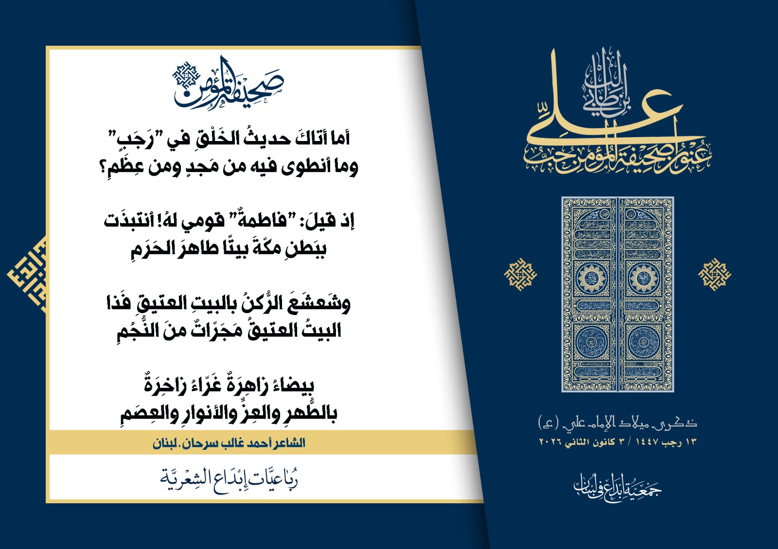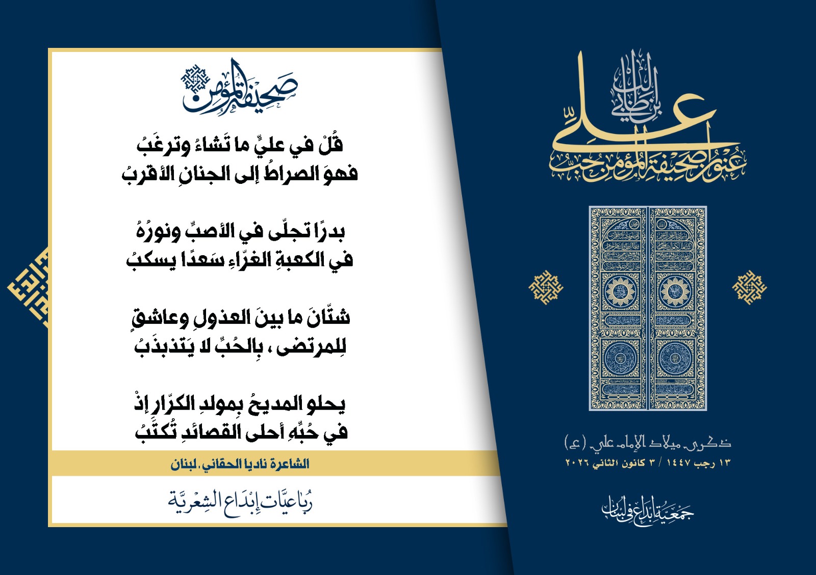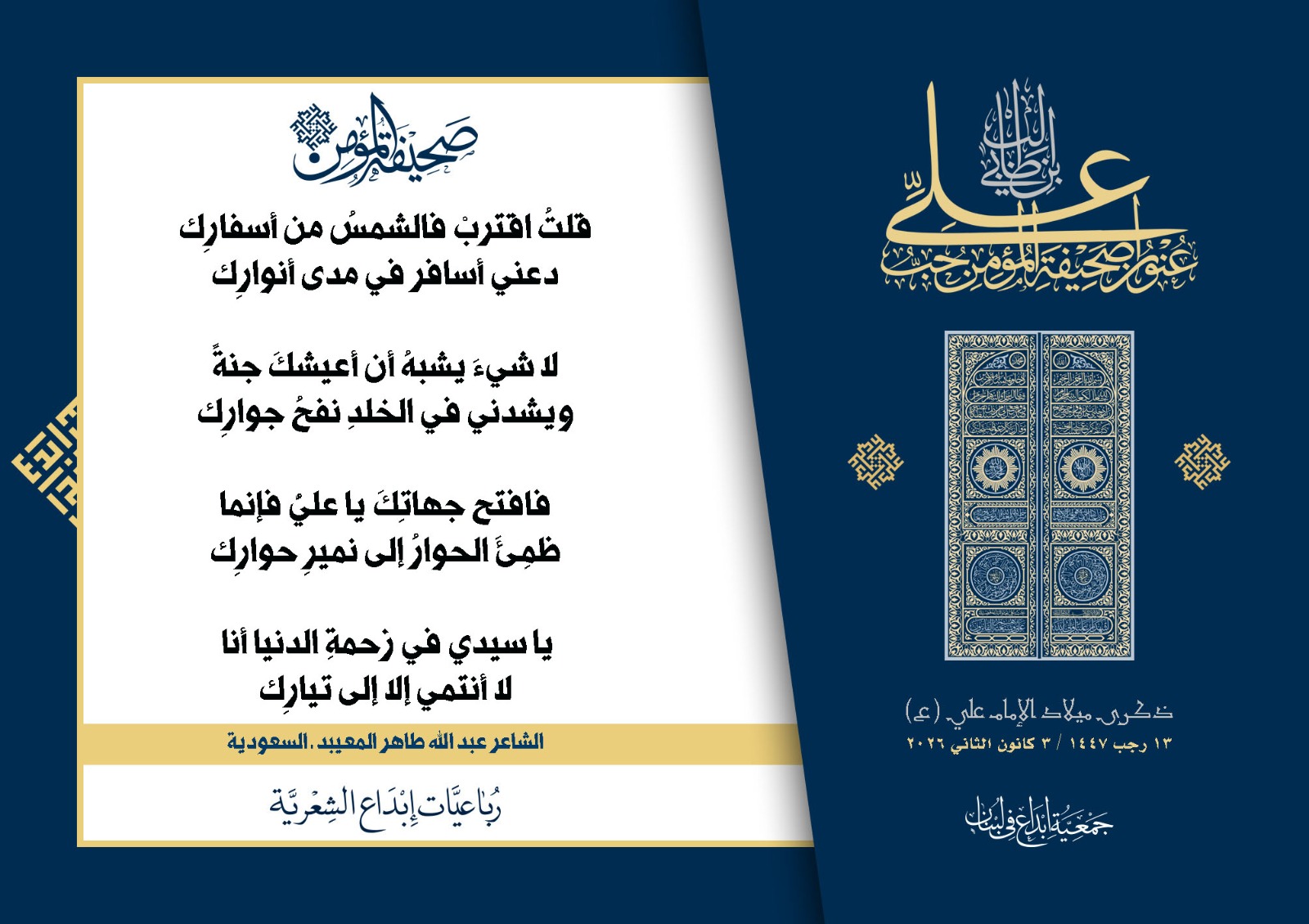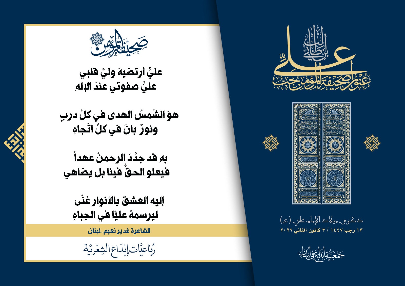 #صحيفة_المؤمن | رباعيات #إبداع الشعرية | ذكرى مولد #أمير_المؤمنين الإمام #علي بن أبي طالب (ع) | #رجب_13 | 1447 هـ/2026 م | جمعية #إبداع في #لبنان | الحملة #1 | المشاركون في الحملة : | 1. الشاعر السيد الحتاني ـ لبنان 2. الشاعر أحمد علي أحمد ـ لبنان 3. الشاعر أحمد غالب سرحان ـ لبنان 4. الشاعر حسن البيومي ـ لبنان 5. الشاعر حسن سامي العبد الله ـ العراق 6. الشاعر حسن علي مهنا ـ لبنان 7. الشاعر حيدر حيال ـ العراق 8. الشاعر داوود ال عبد الرسول السماوي ـ العراق 9. الشاعر عبد الله خليفة ـ لبنان 10. الشاعر عبد الله طاهر المعيبد ـ السعودية 11. الشاعر علي درويش ـ لبنان 12. الشاعر مثيل جبار الزيدي ـ العراق 13. الشاعر محمد علي محمد مهدي السماوي ـ العراق 14. الشاعر محمود شور ـ لبنان 15. الشاعر معن عبد الإله محسن ـ العراق 16. الشاعرة حوراء حميّة ـ لبنان 17. الشاعرة زينب الموسوي ـ لبنان 18. الشاعرة زينب فياض ـ لبنان 19. الشاعرة سارة اليتامى ـ لبنان 20. الشاعرة سكينة سويدان ـ لبنان 21. الشاعرة غدير نعيم ـ لبنان 22. الشاعرة فاطمة السحمراني ـ لبنان 23. الشاعرة كوثر حجازي ـ لبنان 24. الشاعرة مريم عصمان ـ لبنان 25. الشاعرة ناديا الحقاني ـ لبنان 26. الشاعرة نبال رعد ـ لبنان 27. الشاعرة نور طالب ـ لبنان 28. الشاعرة نور مصطفى لمع ـ لبنان 29. الشاعرة هديل كحيل ـ لبنان 30. الشاعرة هناء إبراهيم ـ لبنان #إبداع #رباعيات_شعرية 3/1/2026 .....