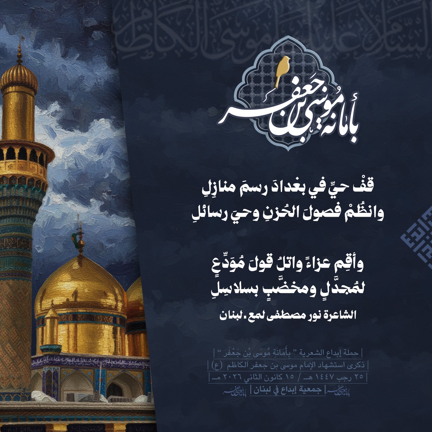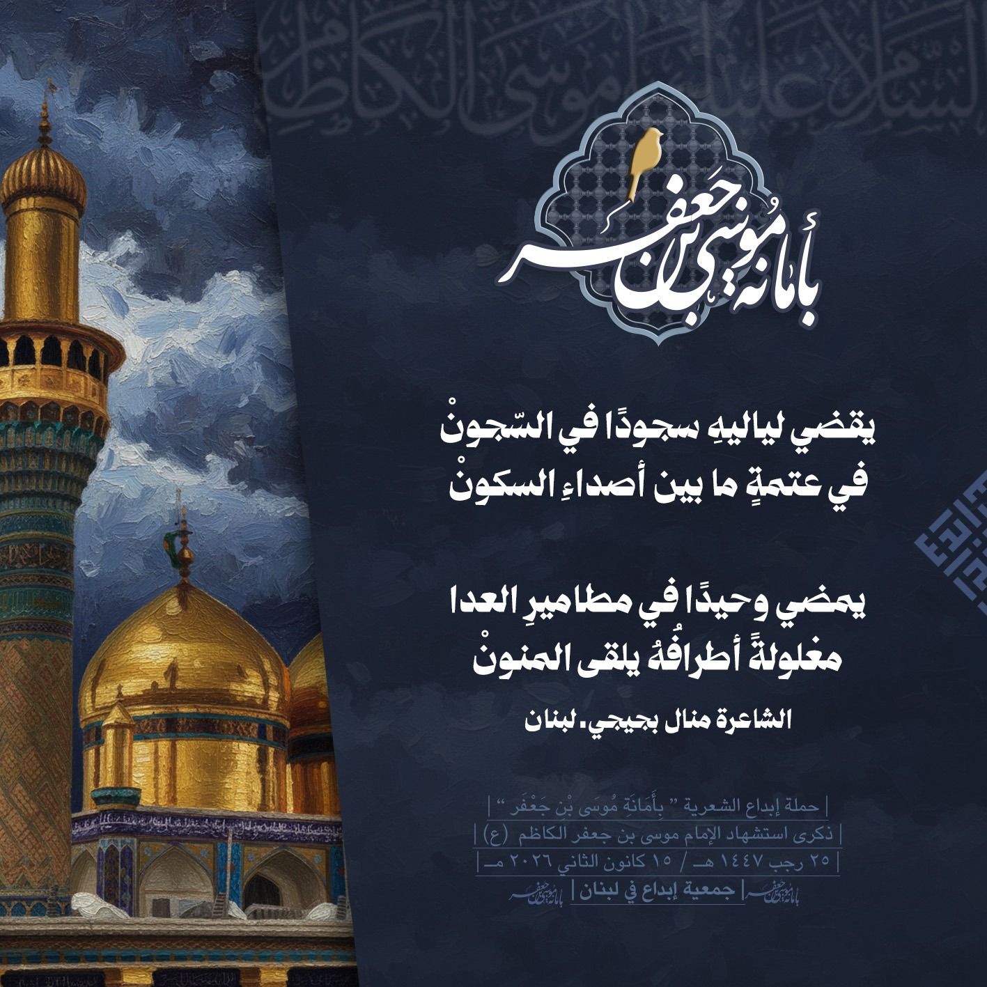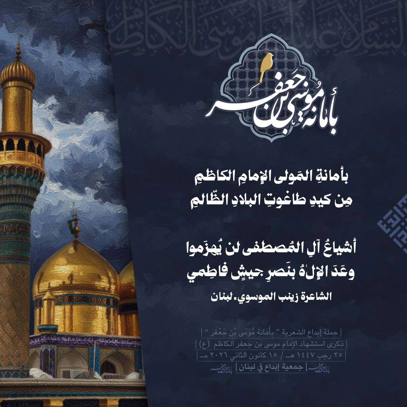 #بأمانة_موسى_بن_جعفر حملة #إبداع الشعرية في ذكرى شهادة الإمام موسى بن جعفر #الكاظم (ع) وفي ظل الهجمة العالمية الاستكبارية على شيعة #آل_محمد (ص) في أوطانهم .. المشاركون في الحملة : 1. الشاعر السيد الحتاني ـ لبنان 2. الشاعر الشيخ حسين فقيه ـ لبنان 3. الشاعر الشيخ سلمان ال عبد الرسول السماوي ـ العراق 4. الشاعر أبو ميرزا مهدي 5. الشاعر حسين آل سهوان ـ القطيف 6. الشاعر داوود ال عبد الرسول السماوي ـ العراق 7. الشاعر رسول باقر ـ العراق 8. الشاعر سليم جواد الشبلي ـ العراق 9. الشاعر علي مرتضى السندي ـ العراق 10. الشاعر فؤاد الراشدي ـ اليمن 11. الشاعر محمد علي محمد مهدي السماوي ـ العراق 12. الشاعر محمود شور ـ لبنان 13. الشاعر معن عبد الإله محسن ـ العراق 14. الشاعر مهدي البزّال ـ لبنان 15. الشاعرة أمل سرور ـ لبنان 16. الشاعرة زينب الموسوي ـ لبنان 17. الشاعرة زينب فياض ـ لبنان 18. الشاعرة سارة اليتامى ـ لبنان 19. الشاعرة غدير أمين ـ لبنان 20. الشاعرة غدير نعيم ـ لبنان 21. الشاعرة فاطمة نظير آل هاني ـ القطيف 22. الشاعرة منال بجيجي ـ لبنان 23. الشاعرة ناديا الحقاني ـ لبنان 24. الشاعرة نبال رعد ـ لبنان 25. الشاعرة نور مصطفى لمع ـ لبنان 26. الشاعرة هناء إبراهيم ـ لبنان #إبداع #بأمانة_موسى_بن_جعفر #استشهاد_الكاظم 15/1/2026 ..... .jpeg)