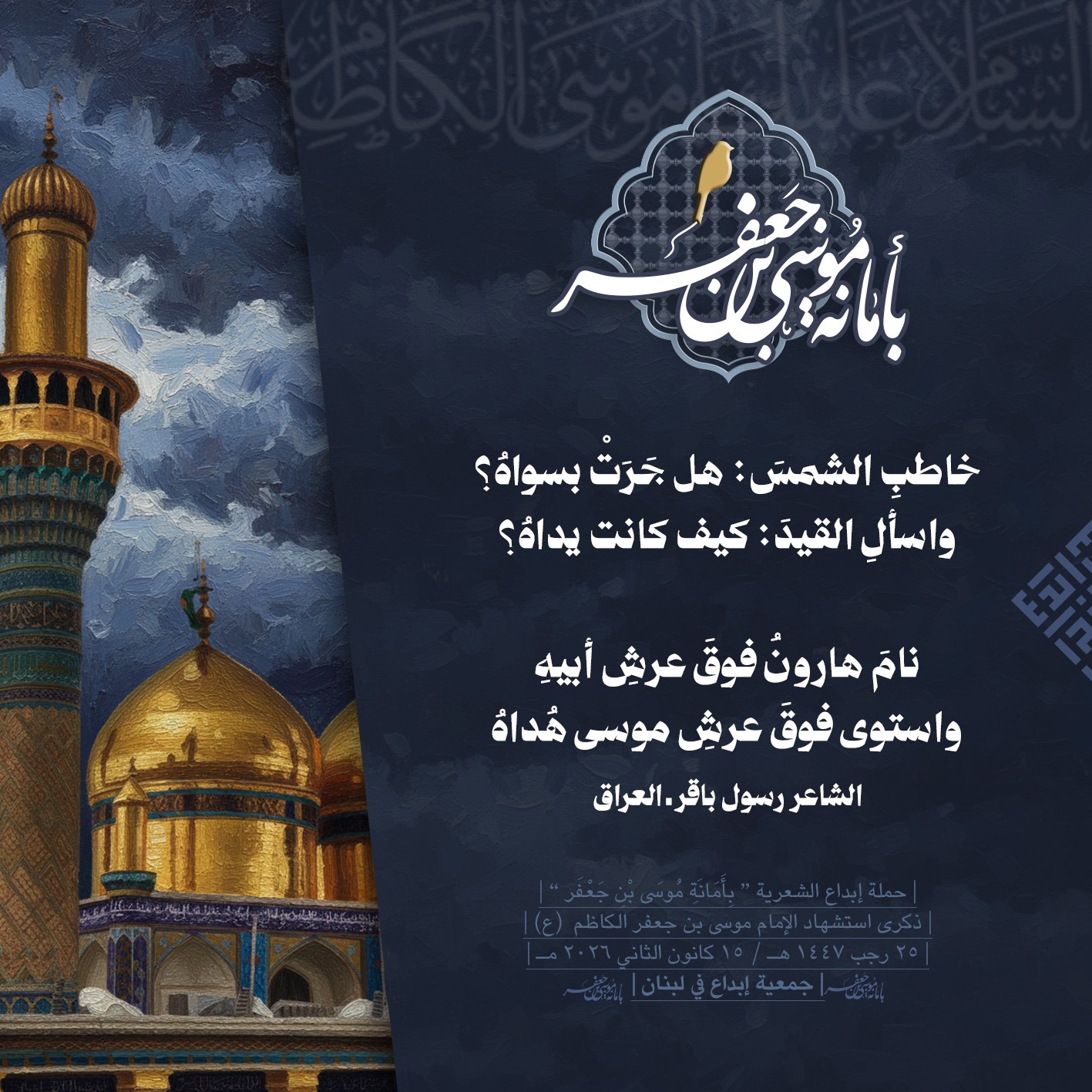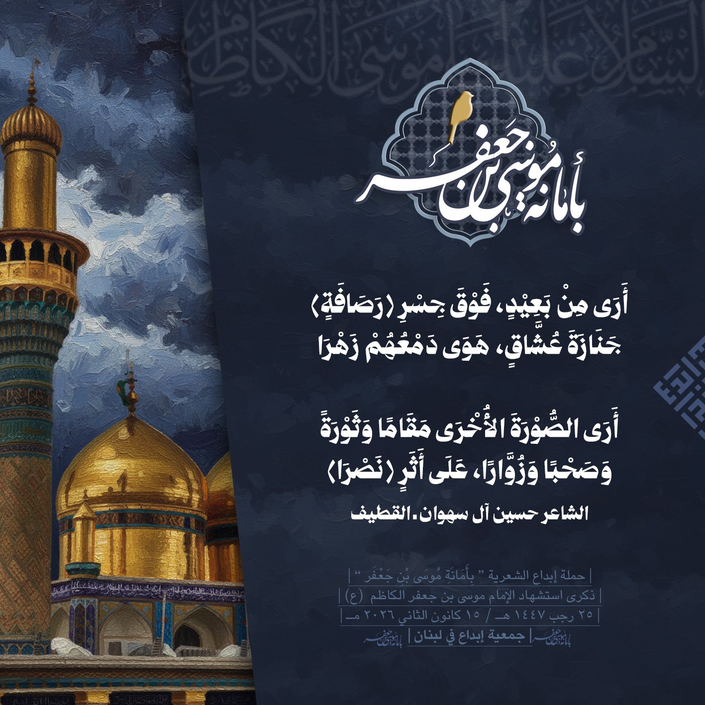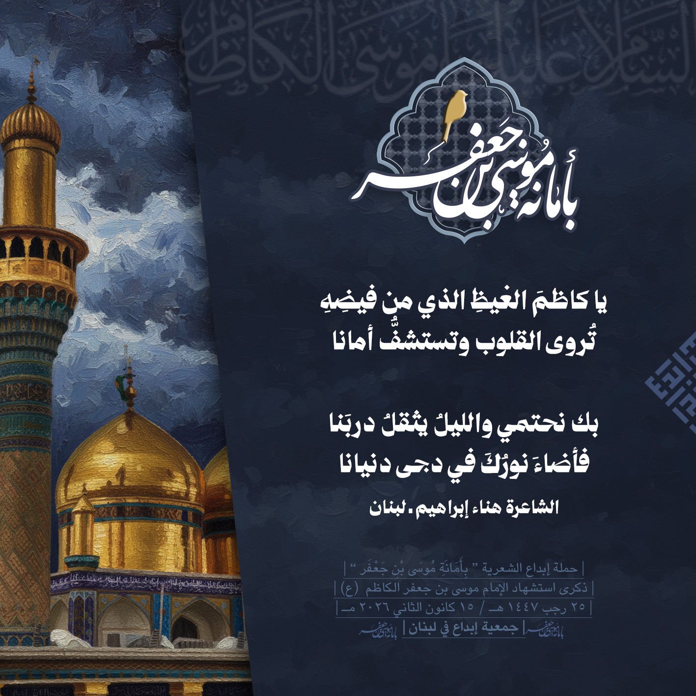 #بأمانة_موسى_بن_جعفر حملة #إبداع الشعرية في ذكرى شهادة الإمام موسى بن جعفر #الكاظم (ع) وفي ظل الهجمة العالمية الاستكبارية على شيعة #آل_محمد (ص) في أوطانهم .. المشاركون في الحملة : 1. الشاعر السيد الحتاني ـ لبنان 2. الشاعر الشيخ حسين فقيه ـ لبنان 3. الشاعر الشيخ سلمان ال عبد الرسول السماوي ـ العراق 4. الشاعر أبو ميرزا مهدي 5. الشاعر حسين آل سهوان ـ القطيف 6. الشاعر داوود ال عبد الرسول السماوي ـ العراق 7. الشاعر رسول باقر ـ العراق 8. الشاعر سليم جواد الشبلي ـ العراق 9. الشاعر علي مرتضى السندي ـ العراق 10. الشاعر فؤاد الراشدي ـ اليمن 11. الشاعر محمد علي محمد مهدي السماوي ـ العراق 12. الشاعر محمود شور ـ لبنان 13. الشاعر معن عبد الإله محسن ـ العراق 14. الشاعر مهدي البزّال ـ لبنان 15. الشاعرة أمل سرور ـ لبنان 16. الشاعرة زينب الموسوي ـ لبنان 17. الشاعرة زينب فياض ـ لبنان 18. الشاعرة سارة اليتامى ـ لبنان 19. الشاعرة غدير أمين ـ لبنان 20. الشاعرة غدير نعيم ـ لبنان 21. الشاعرة فاطمة نظير آل هاني ـ القطيف 22. الشاعرة منال بجيجي ـ لبنان 23. الشاعرة ناديا الحقاني ـ لبنان 24. الشاعرة نبال رعد ـ لبنان 25. الشاعرة نور مصطفى لمع ـ لبنان 26. الشاعرة هناء إبراهيم ـ لبنان #إبداع #بأمانة_موسى_بن_جعفر #استشهاد_الكاظم 15/1/2026 ..... .jpeg)