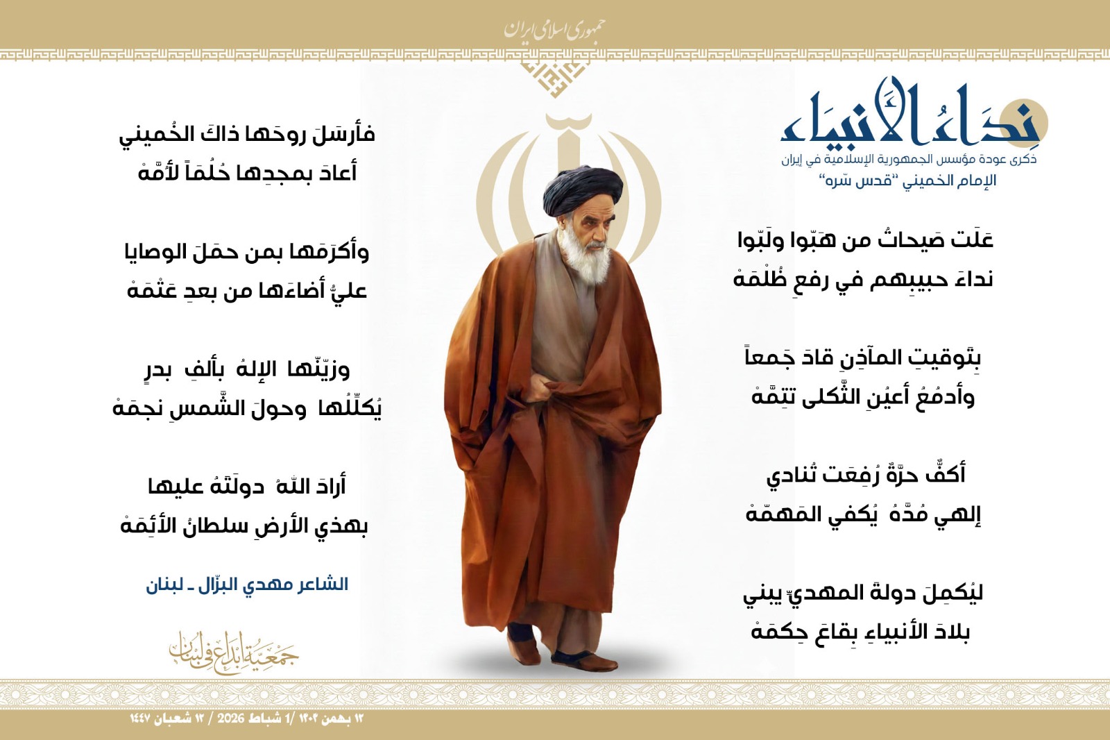 #نداء_الأنبياء #نداء_الأنبياء حملة #إبداع الشعرية في ذكرى عودة الإمام الخميني الراحل إلى #إيران وبداية #عشرة_الفجر لانتصار الثورة الإسلامية في إيران .. شارك في الحملة كل من : 1. الشاعر داوود ال عبد الرسول السماوي ـ العراق 2. الشاعر علي درويش ـ لبنان 3. الشاعر فؤاد الراشدي ـ اليمن 4. الشاعر محمود شور ـ لبنان 5. الشاعر معن عبد الإله محسن ـ العراق 6. الشاعر مهدي البزّال ـ لبنان 7. الشاعرة زهراء درويش ـ لبنان 8. الشاعرة زينب الموسوي ـ لبنان 9. الشاعرة زينب فياض ـ لبنان 10. الشاعرة مريم عصمان ـ لبنان 11. الشاعرة ناديا الحقاني ـ لبنان 12. الشاعرة هناء إبراهيم ـ لبنان #إبداع #نداء_الأنبياء #عودة_الإمام #إيران أول شباط 2026 ......