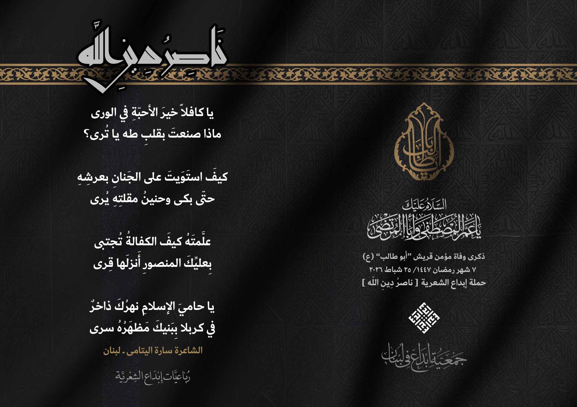 #ناصر_دين_الله أطلقت جمعية #إبداع في لبنان رباعيات #ناصر_دين_الله الشعرية لمناسبة ذكرى وفاة عم النبي محمد (ص) ووالد الإمام علي (ع)، الصحابي الهاشمي كفيل الرسالة وحاميها أبي طالب بن عبد المطلب (عليهما السلام) .. وقد شارك الرباعيات كل من : 1. الشاعر السيد الحتاني ـ لبنان 2. الشاعر الشيخ حسين فقيه ـ لبنان 3. الشاعر أحمد علي أحمد ـ لبنان 4. الشاعر جواد حايك ـ لبنان 5. الشاعر داوود ال عبد الرسول السماوي ـ العراق 6. الشاعر ضياء عاشور ـ العراق 7. الشاعر محمود شور ـ لبنان 8. الشاعر معن عبد الإله محسن ـ العراق 9. الشاعر مهدي البزّال ـ لبنان 10. الشاعرة زينب الموسوي ـ لبنان 11. الشاعرة سارة اليتامى ـ لبنان 12. الشاعرة عزيزة جميل ـ لبنان 13. الشاعرة فاطمة العوطة ـ لبنان 14. الشاعرة فاطمة نظير آل هاني ـ القطيف 15. الشاعرة ميسم مغنية ـ لبنان 16. الشاعرة ناديا الحقاني ـ لبنان 17. الشاعرة نبال رعد ـ لبنان .... #إبداع 25_2_2026 #ناصر_دين_الله #وفاة_أبي_طالب #رباعيات_شعرية