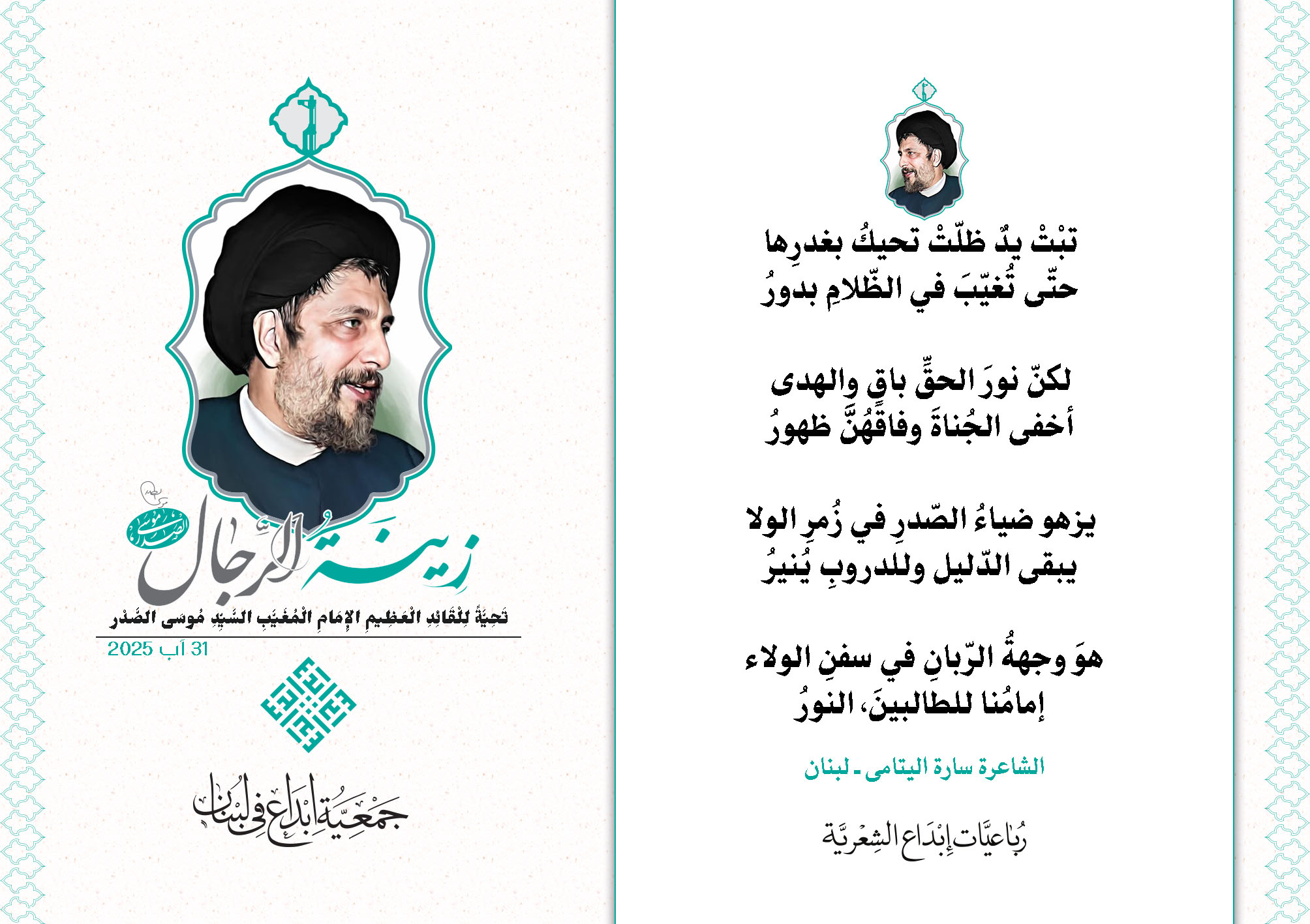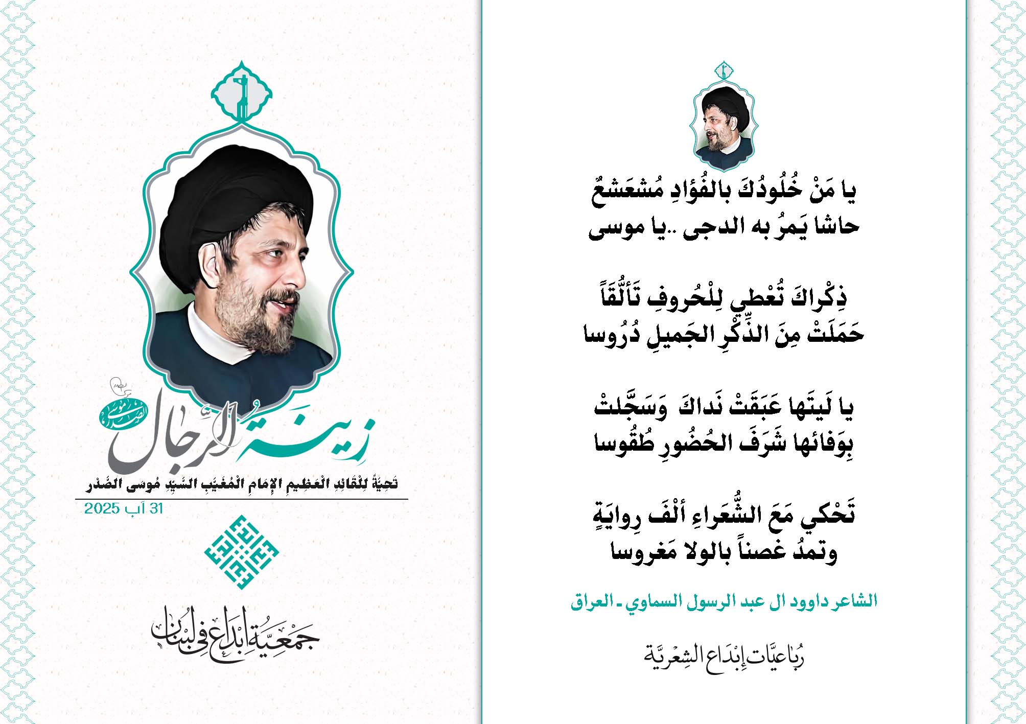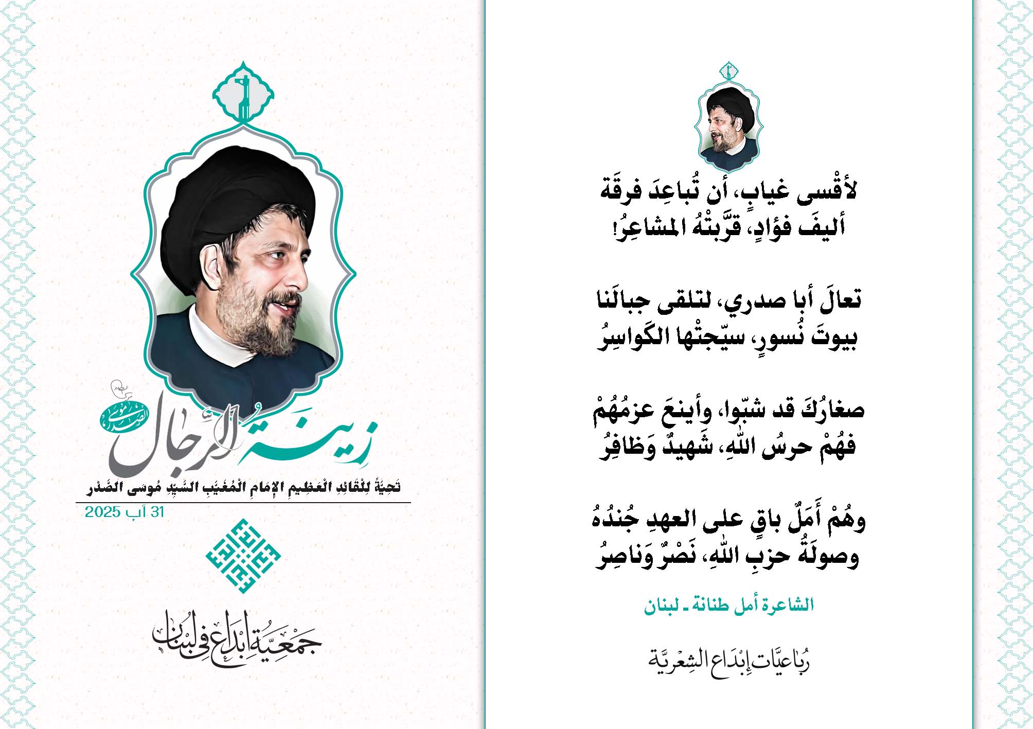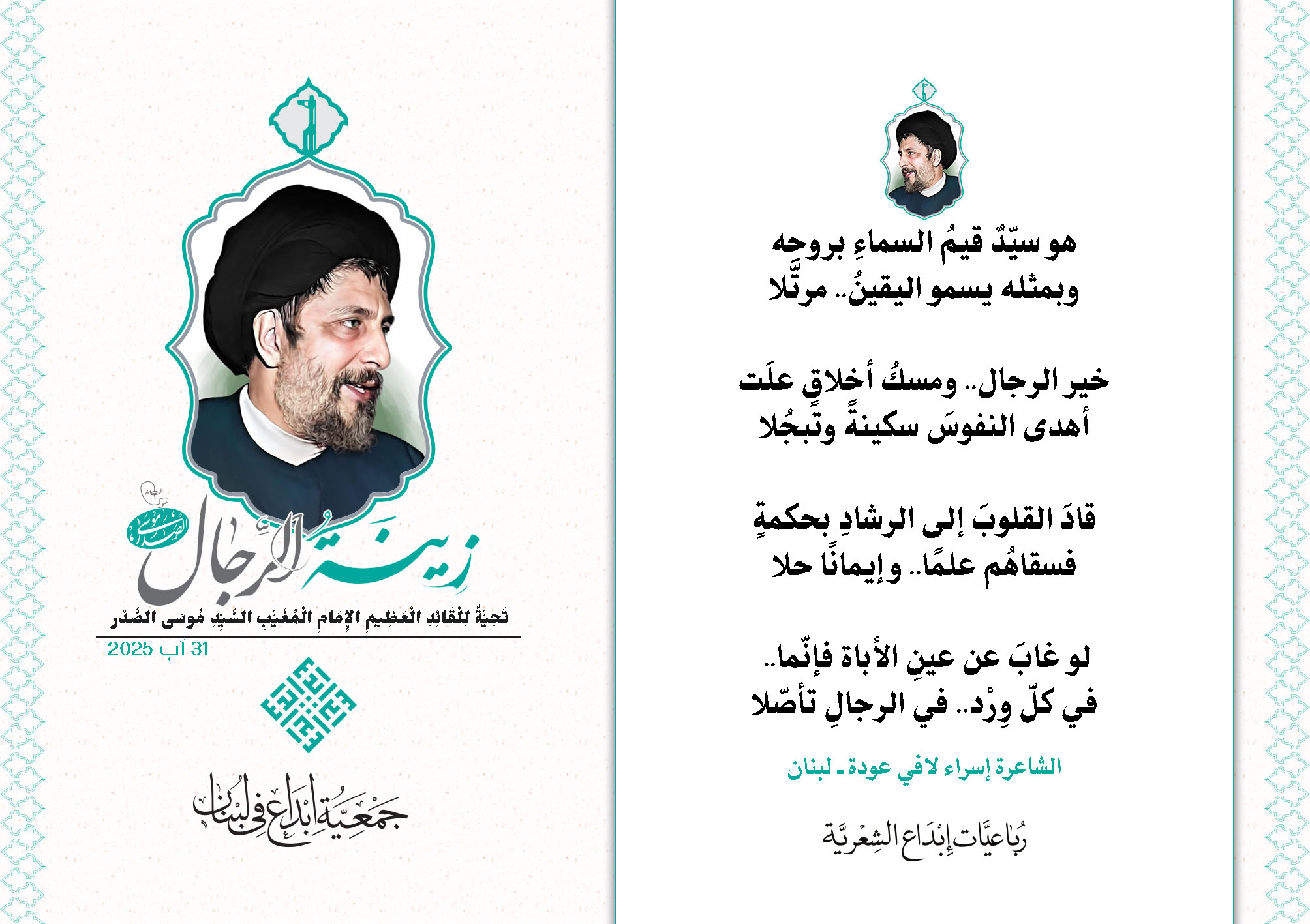 اطلقت جمعية ابداع في لبنان حملة شعرية تحت عنوان زينة الرجال و ذلك في ذكرى تغييب الامام السيد موسى الصدر اعاده الله 30/8/2025