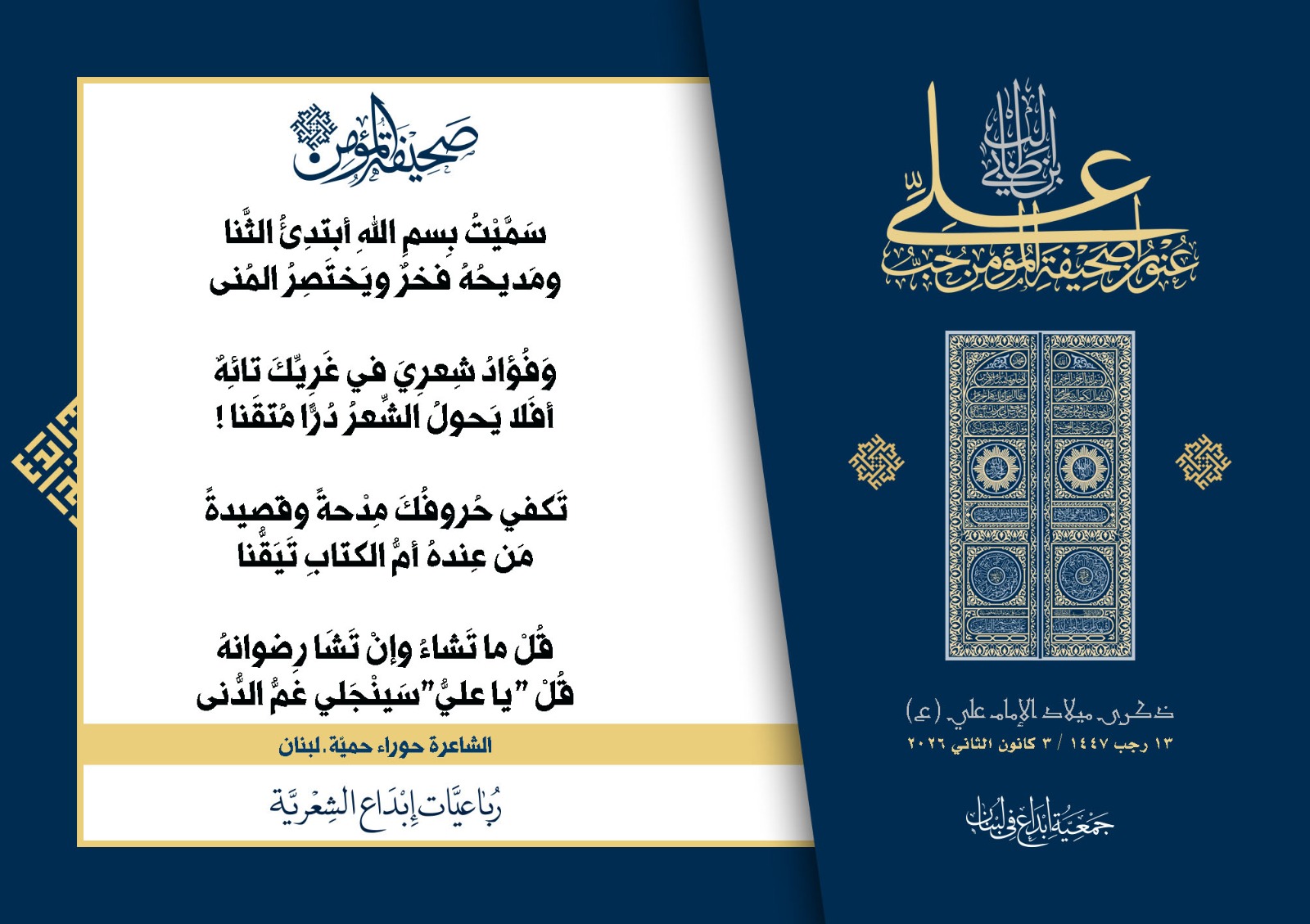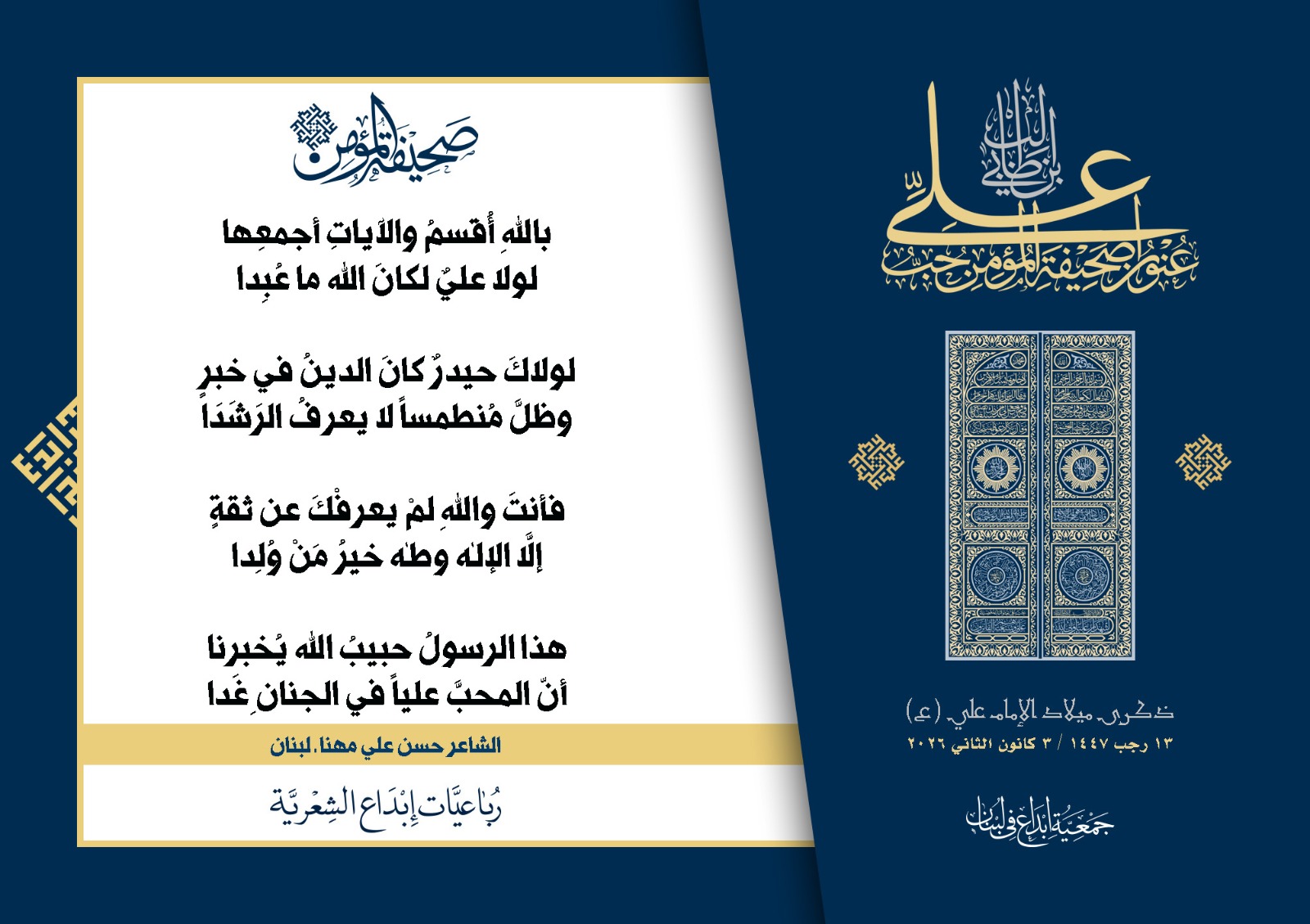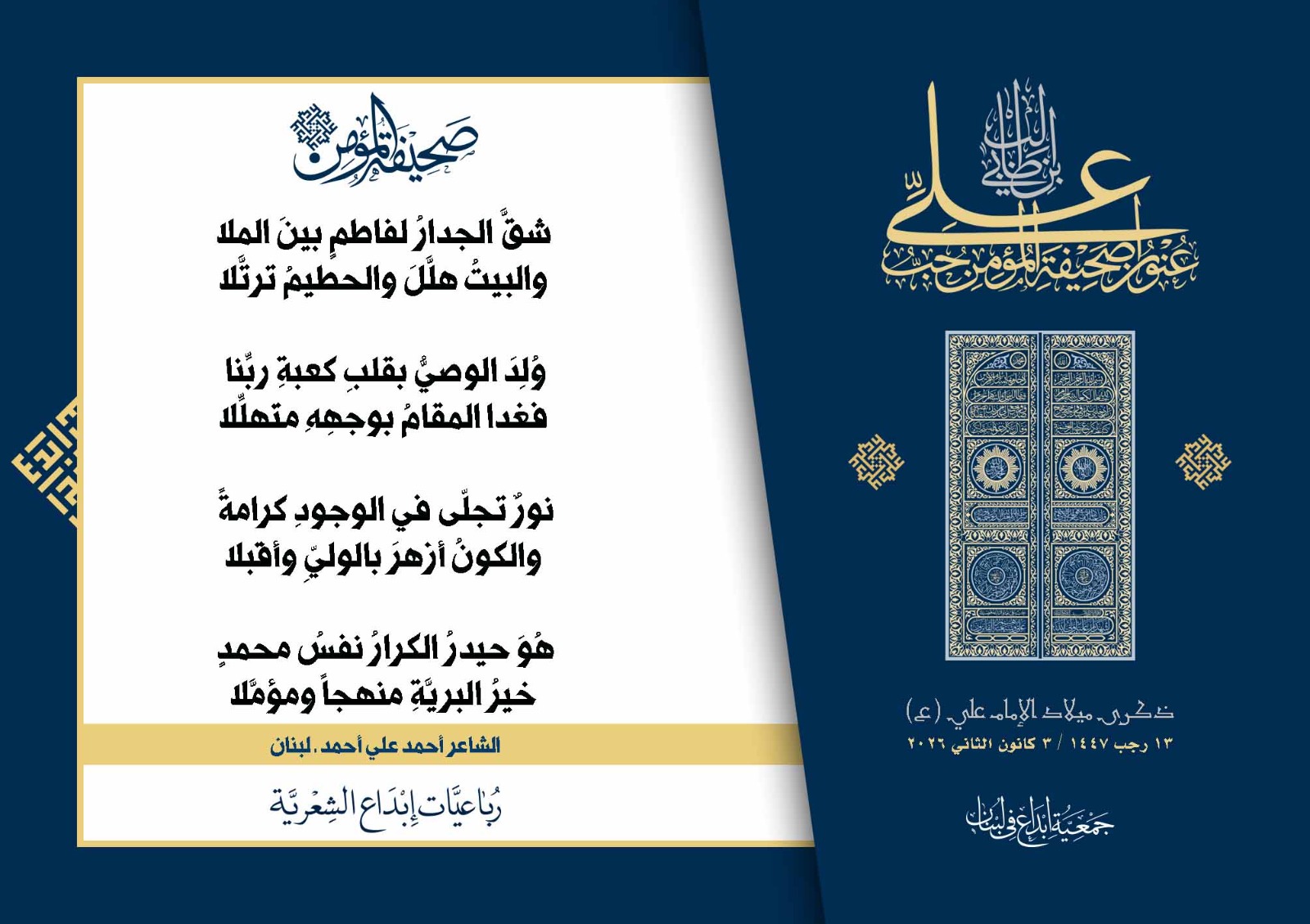 #صحيفة_المؤمن | رباعيات #إبداع الشعرية | ذكرى مولد #أمير_المؤمنين الإمام #علي بن أبي طالب (ع) | #رجب_13 | 1447 هـ/2026 م | جمعية #إبداع في #لبنان | الحملة #1 | المشاركون في الحملة : | 1. الشاعر السيد الحتاني ـ لبنان 2. الشاعر أحمد علي أحمد ـ لبنان 3. الشاعر أحمد غالب سرحان ـ لبنان 4. الشاعر حسن البيومي ـ لبنان 5. الشاعر حسن سامي العبد الله ـ العراق 6. الشاعر حسن علي مهنا ـ لبنان 7. الشاعر حيدر حيال ـ العراق 8. الشاعر داوود ال عبد الرسول السماوي ـ العراق 9. الشاعر عبد الله خليفة ـ لبنان 10. الشاعر عبد الله طاهر المعيبد ـ السعودية 11. الشاعر علي درويش ـ لبنان 12. الشاعر مثيل جبار الزيدي ـ العراق 13. الشاعر محمد علي محمد مهدي السماوي ـ العراق 14. الشاعر محمود شور ـ لبنان 15. الشاعر معن عبد الإله محسن ـ العراق 16. الشاعرة حوراء حميّة ـ لبنان 17. الشاعرة زينب الموسوي ـ لبنان 18. الشاعرة زينب فياض ـ لبنان 19. الشاعرة سارة اليتامى ـ لبنان 20. الشاعرة سكينة سويدان ـ لبنان 21. الشاعرة غدير نعيم ـ لبنان 22. الشاعرة فاطمة السحمراني ـ لبنان 23. الشاعرة كوثر حجازي ـ لبنان 24. الشاعرة مريم عصمان ـ لبنان 25. الشاعرة ناديا الحقاني ـ لبنان 26. الشاعرة نبال رعد ـ لبنان 27. الشاعرة نور طالب ـ لبنان 28. الشاعرة نور مصطفى لمع ـ لبنان 29. الشاعرة هديل كحيل ـ لبنان 30. الشاعرة هناء إبراهيم ـ لبنان #إبداع #رباعيات_شعرية 3/1/2026 .....