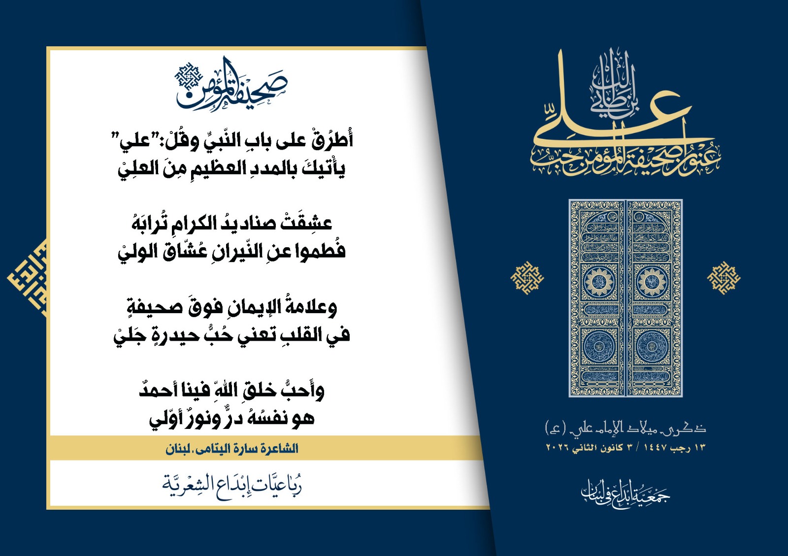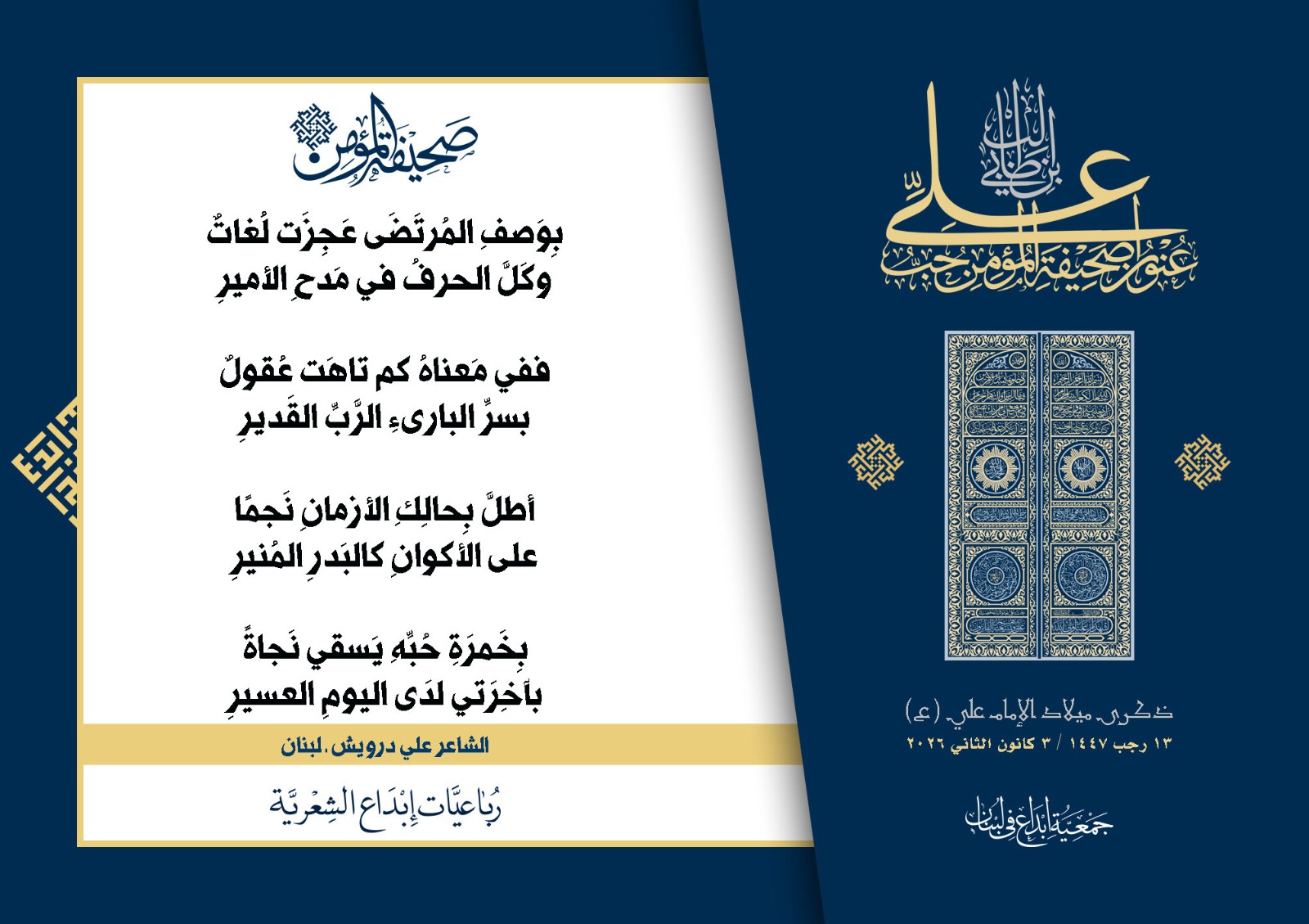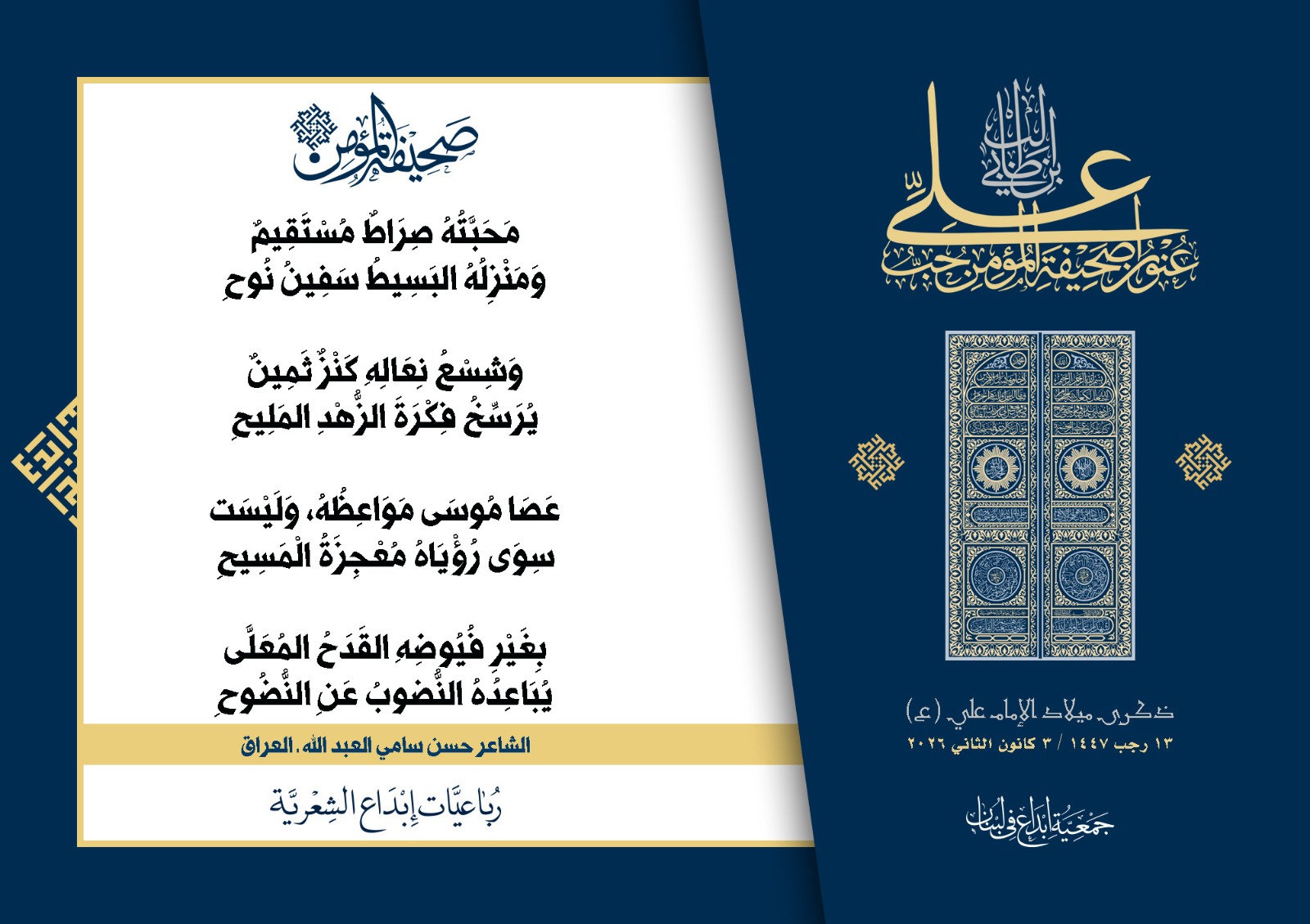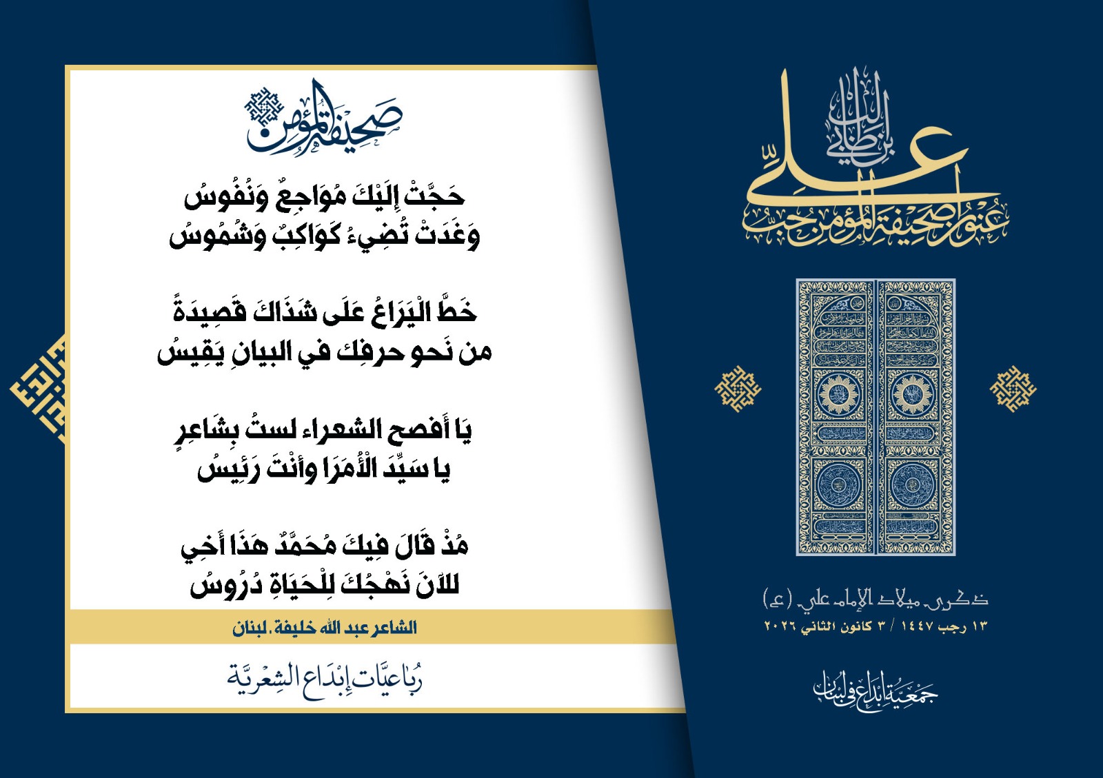 #صحيفة_المؤمن | رباعيات #إبداع الشعرية | ذكرى مولد #أمير_المؤمنين الإمام #علي بن أبي طالب (ع) | #رجب_13 | 1447 هـ/2026 م | جمعية #إبداع في #لبنان | الحملة #1 | المشاركون في الحملة : | 1. الشاعر السيد الحتاني ـ لبنان 2. الشاعر أحمد علي أحمد ـ لبنان 3. الشاعر أحمد غالب سرحان ـ لبنان 4. الشاعر حسن البيومي ـ لبنان 5. الشاعر حسن سامي العبد الله ـ العراق 6. الشاعر حسن علي مهنا ـ لبنان 7. الشاعر حيدر حيال ـ العراق 8. الشاعر داوود ال عبد الرسول السماوي ـ العراق 9. الشاعر عبد الله خليفة ـ لبنان 10. الشاعر عبد الله طاهر المعيبد ـ السعودية 11. الشاعر علي درويش ـ لبنان 12. الشاعر مثيل جبار الزيدي ـ العراق 13. الشاعر محمد علي محمد مهدي السماوي ـ العراق 14. الشاعر محمود شور ـ لبنان 15. الشاعر معن عبد الإله محسن ـ العراق 16. الشاعرة حوراء حميّة ـ لبنان 17. الشاعرة زينب الموسوي ـ لبنان 18. الشاعرة زينب فياض ـ لبنان 19. الشاعرة سارة اليتامى ـ لبنان 20. الشاعرة سكينة سويدان ـ لبنان 21. الشاعرة غدير نعيم ـ لبنان 22. الشاعرة فاطمة السحمراني ـ لبنان 23. الشاعرة كوثر حجازي ـ لبنان 24. الشاعرة مريم عصمان ـ لبنان 25. الشاعرة ناديا الحقاني ـ لبنان 26. الشاعرة نبال رعد ـ لبنان 27. الشاعرة نور طالب ـ لبنان 28. الشاعرة نور مصطفى لمع ـ لبنان 29. الشاعرة هديل كحيل ـ لبنان 30. الشاعرة هناء إبراهيم ـ لبنان #إبداع #رباعيات_شعرية 3/1/2026 .....