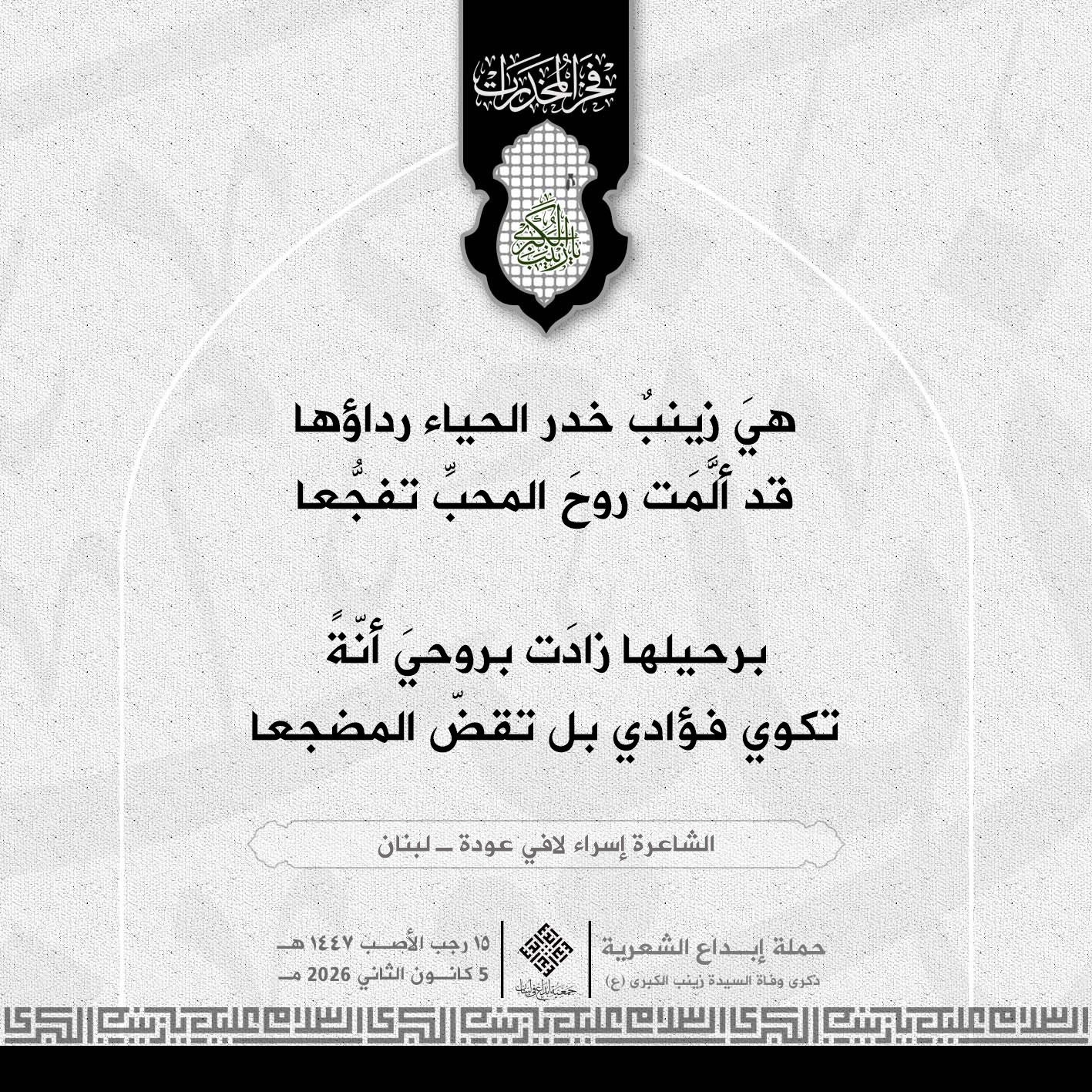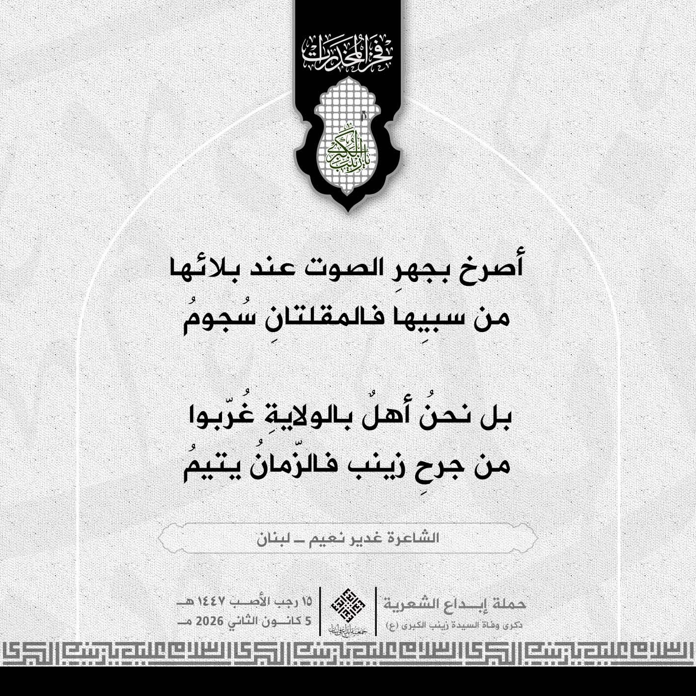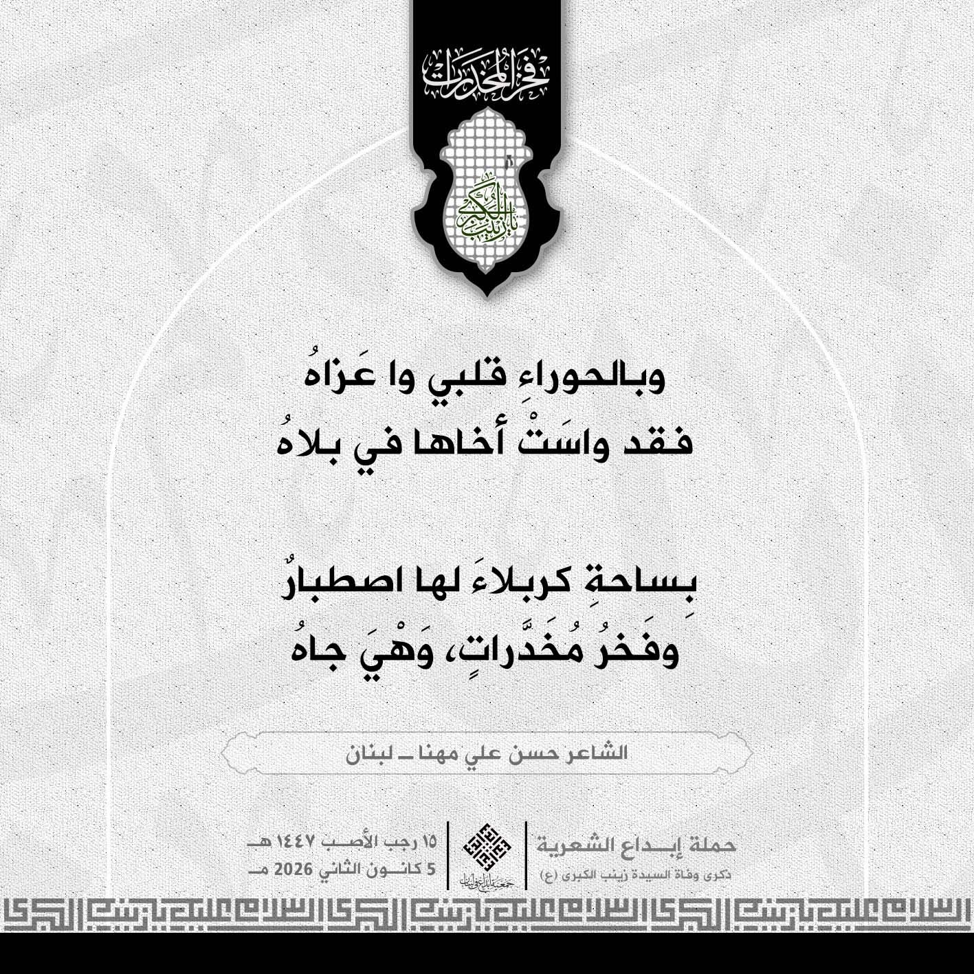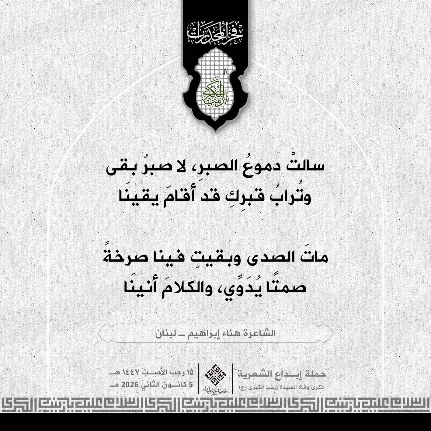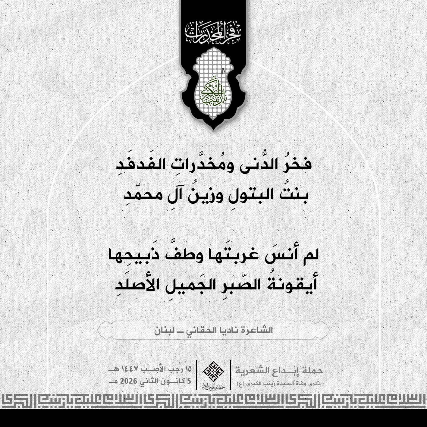 | #فخر_المخدرات | حملة #إبداع الشعرية | في ذكرى وفاة عقيلة بني هاشم السيدة #زينب_الكبرى (ع) | #رجب_15 1447 هـ/ 2026 | المشاركون في الحملة : 1. الشاعر السيد الحتاني ـ لبنان 2. الشاعر حسن علي مهنا ـ لبنان 3. الشاعر داوود ال عبد الرسول السماوي ـ العراق 4. الشاعر رسول باقر ـ العراق 5. الشاعر علي درويش ـ لبنان 6. الشاعر فؤاد الراشدي ـ اليمن 7. الشاعر محمود شور ـ لبنان 8. الشاعر معن عبد الإله محسن ـ العراق 9. الشاعر مهدي البزّال ـ لبنان 10. الشاعر وسيم مهنا ـ لبنان 11. الشاعرة إسراء لافي عودة ـ لبنان 12. الشاعرة حوراء جشي ـ لبنان 13. الشاعرة حوراء حميّة ـ لبنان 14. الشاعرة زينب الموسوي ـ لبنان 15. الشاعرة زينب فياض ـ لبنان 16. الشاعرة سكينة سويدان ـ لبنان 17. الشاعرة عزيزة جميل ـ لبنان 18. الشاعرة غدير نعيم ـ لبنان 19. الشاعرة فاطمة السحمراني ـ لبنان 20. الشاعرة مريم عصمان ـ لبنان 21. الشاعرة منال بجيجي ـ لبنان 22. الشاعرة ناديا الحقاني ـ لبنان 23. الشاعرة نبال رعد ـ لبنان 24. الشاعرة هناء إبراهيم ـ لبنان #فخر_المخدرات #وفاة_زينب_الكبرى #إبداع 5/1/2026 .....