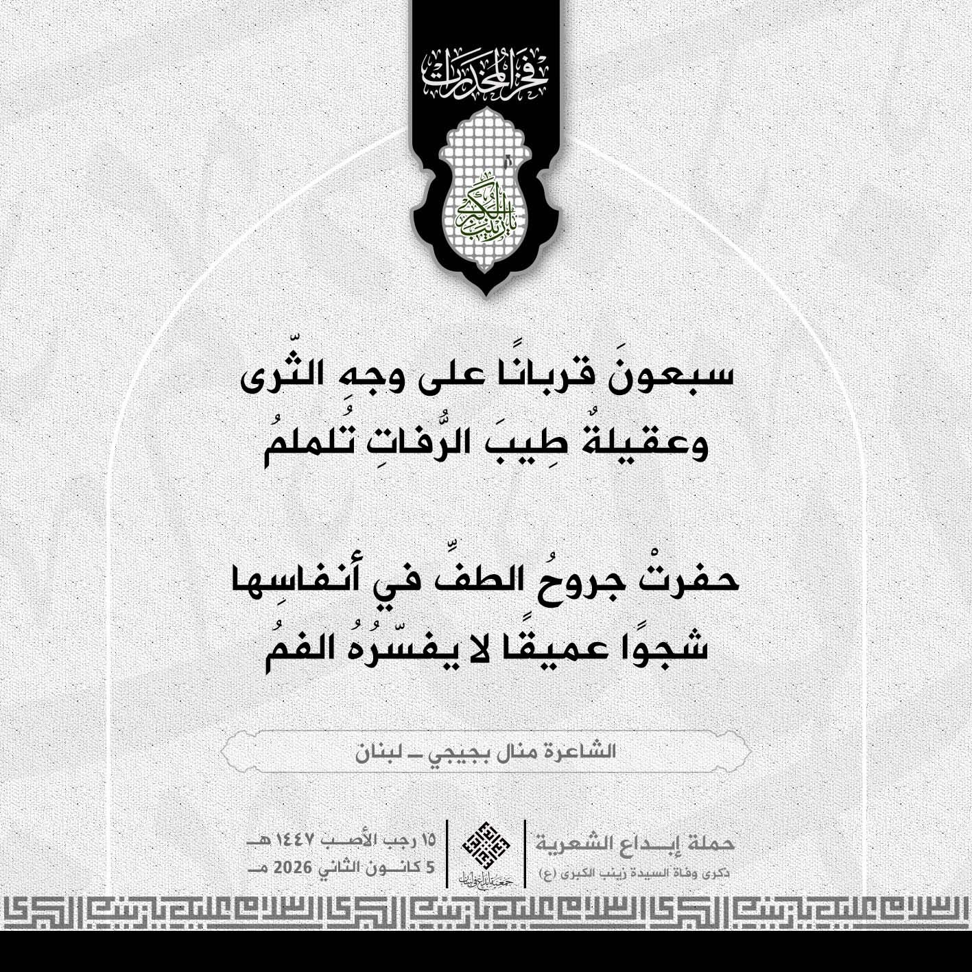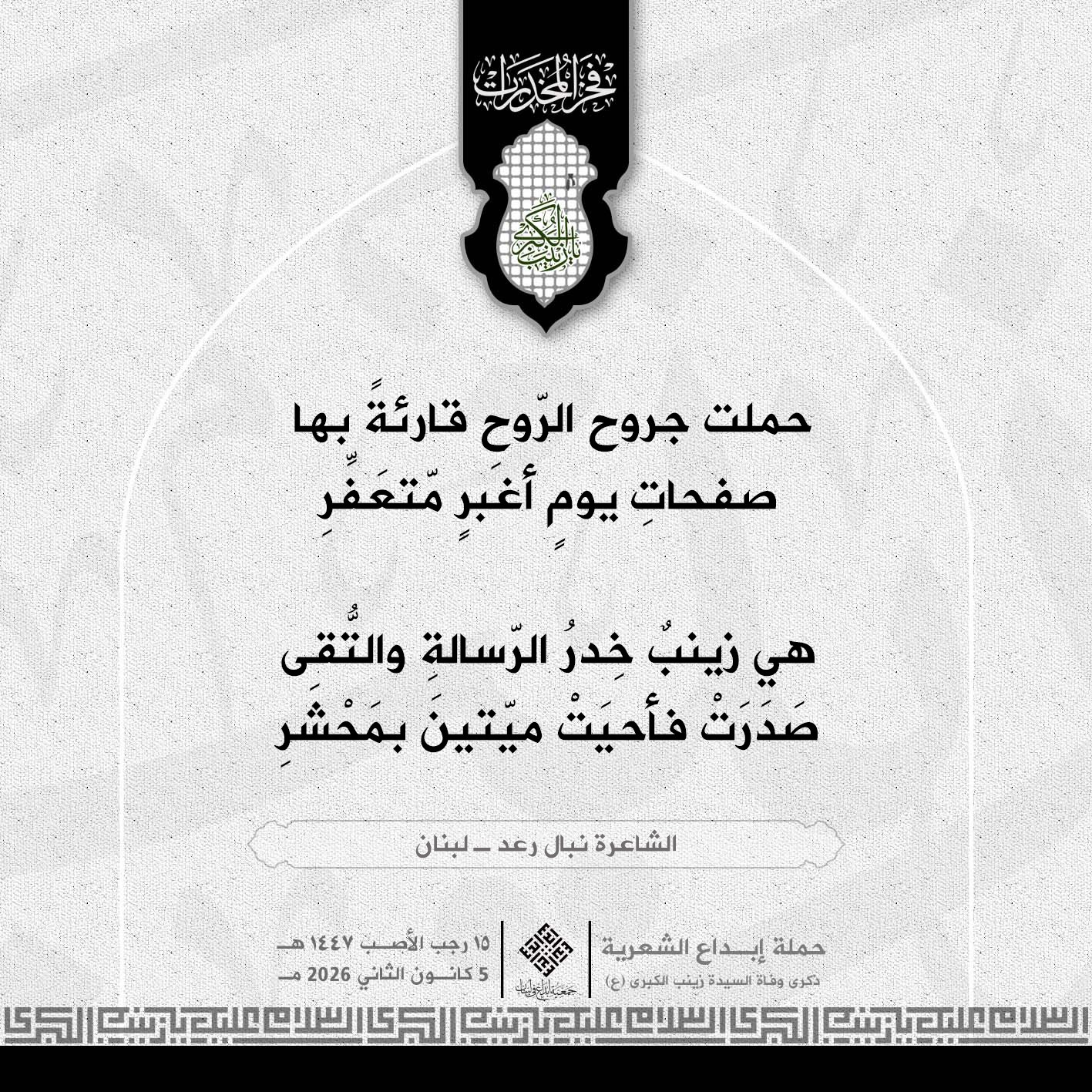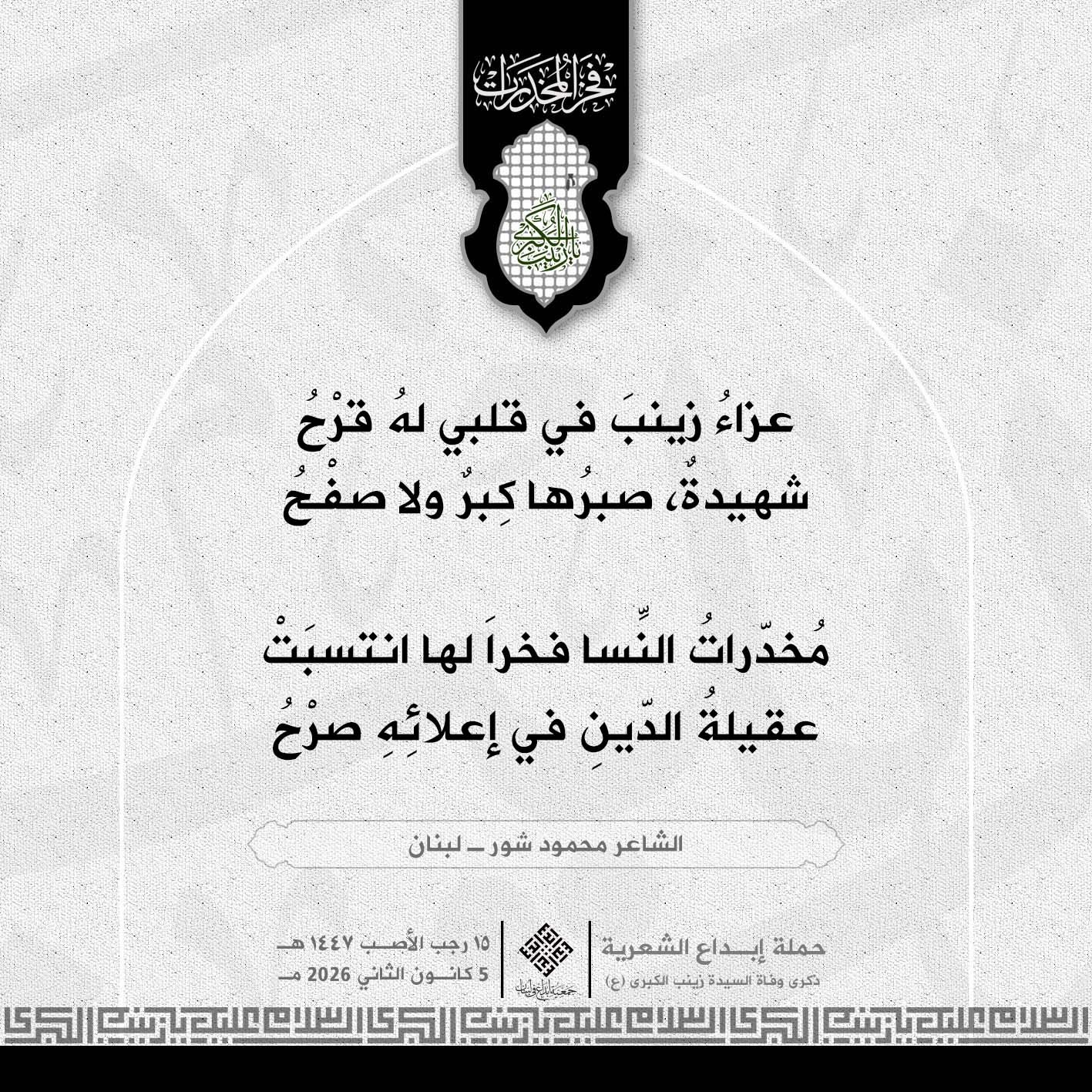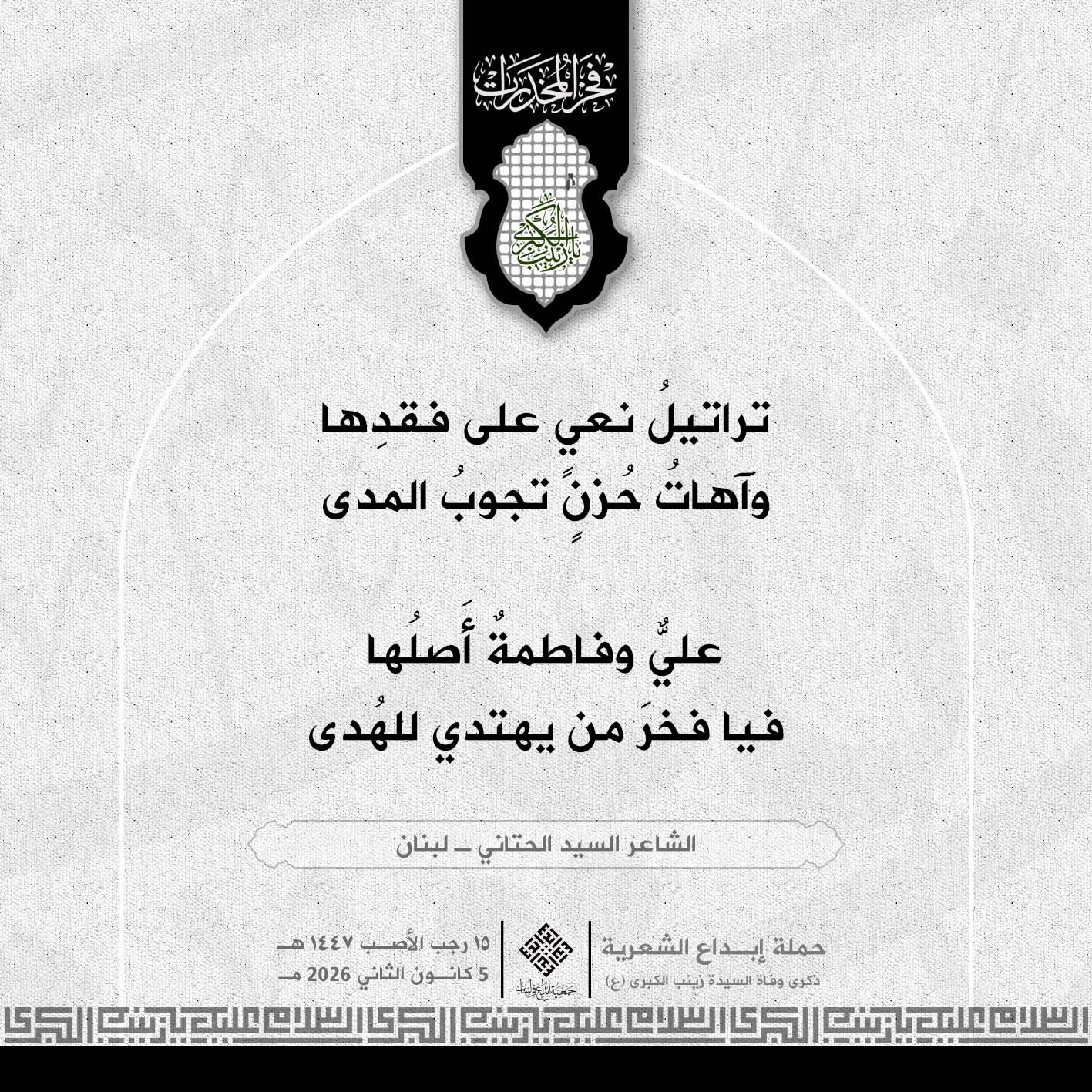 | #فخر_المخدرات | حملة #إبداع الشعرية | في ذكرى وفاة عقيلة بني هاشم السيدة #زينب_الكبرى (ع) | #رجب_15 1447 هـ/ 2026 | المشاركون في الحملة : 1. الشاعر السيد الحتاني ـ لبنان 2. الشاعر حسن علي مهنا ـ لبنان 3. الشاعر داوود ال عبد الرسول السماوي ـ العراق 4. الشاعر رسول باقر ـ العراق 5. الشاعر علي درويش ـ لبنان 6. الشاعر فؤاد الراشدي ـ اليمن 7. الشاعر محمود شور ـ لبنان 8. الشاعر معن عبد الإله محسن ـ العراق 9. الشاعر مهدي البزّال ـ لبنان 10. الشاعر وسيم مهنا ـ لبنان 11. الشاعرة إسراء لافي عودة ـ لبنان 12. الشاعرة حوراء جشي ـ لبنان 13. الشاعرة حوراء حميّة ـ لبنان 14. الشاعرة زينب الموسوي ـ لبنان 15. الشاعرة زينب فياض ـ لبنان 16. الشاعرة سكينة سويدان ـ لبنان 17. الشاعرة عزيزة جميل ـ لبنان 18. الشاعرة غدير نعيم ـ لبنان 19. الشاعرة فاطمة السحمراني ـ لبنان 20. الشاعرة مريم عصمان ـ لبنان 21. الشاعرة منال بجيجي ـ لبنان 22. الشاعرة ناديا الحقاني ـ لبنان 23. الشاعرة نبال رعد ـ لبنان 24. الشاعرة هناء إبراهيم ـ لبنان #فخر_المخدرات #وفاة_زينب_الكبرى #إبداع 5/1/2026 .....