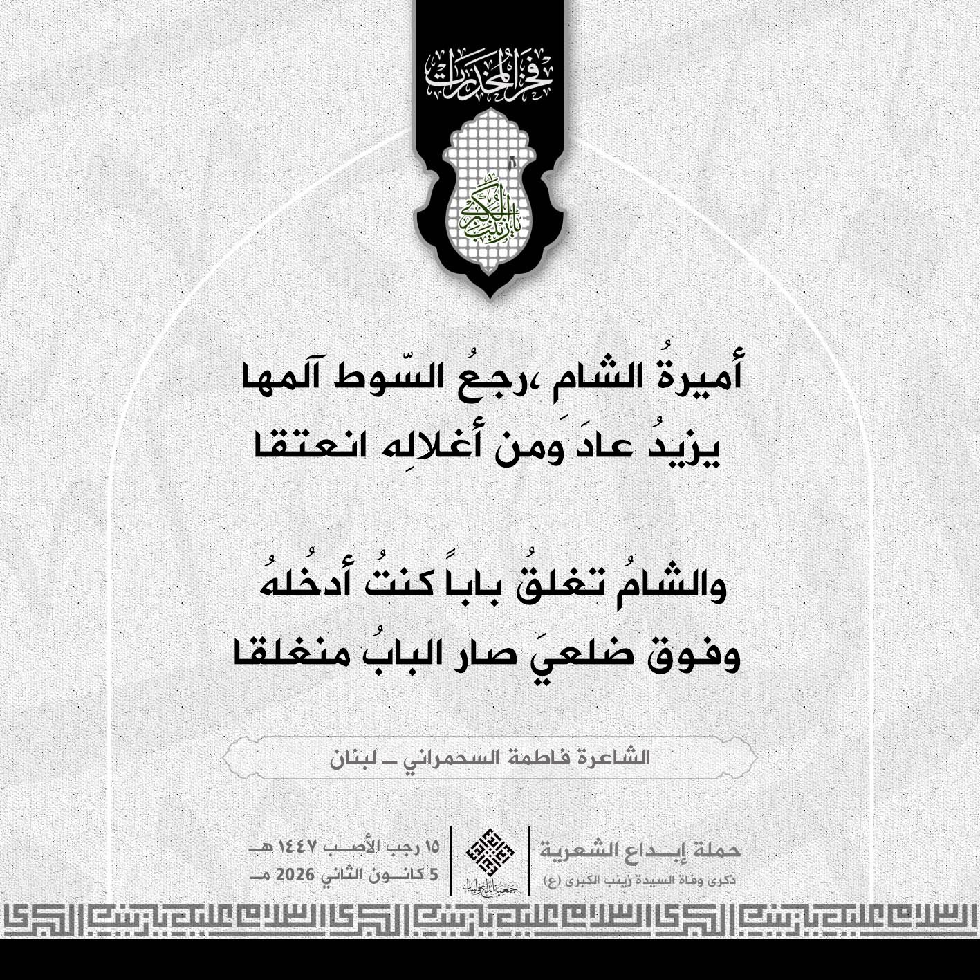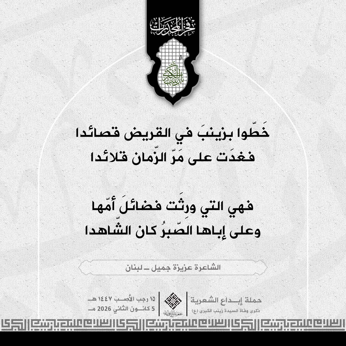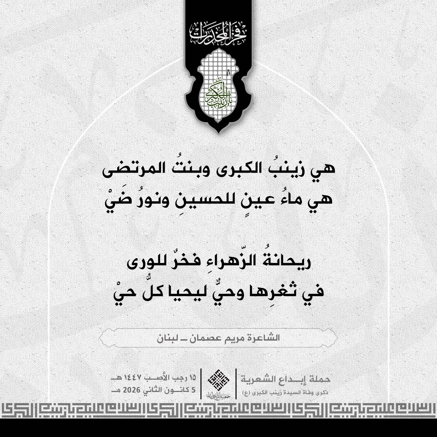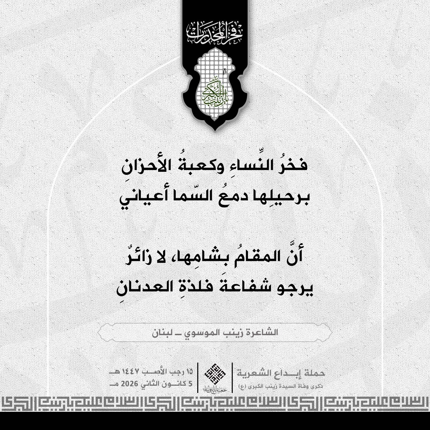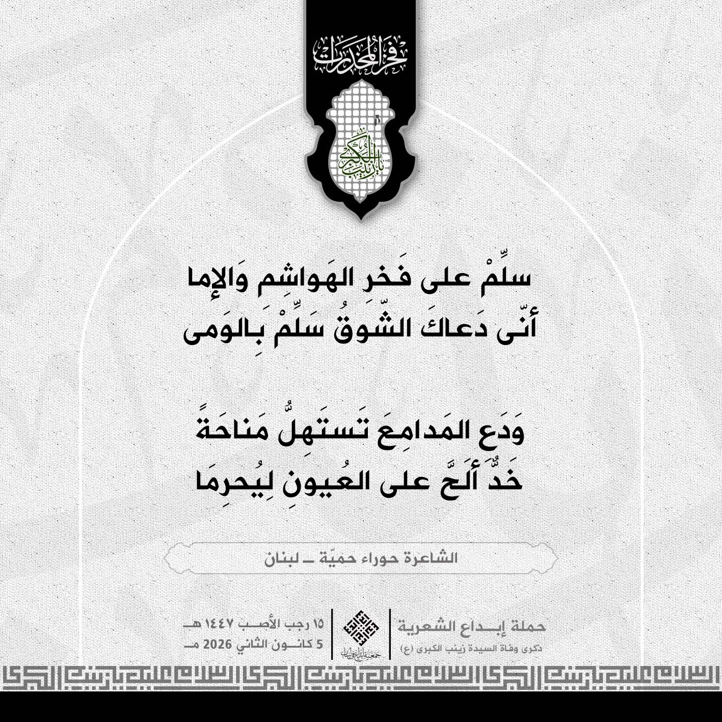 | #فخر_المخدرات | حملة #إبداع الشعرية | في ذكرى وفاة عقيلة بني هاشم السيدة #زينب_الكبرى (ع) | #رجب_15 1447 هـ/ 2026 | المشاركون في الحملة : 1. الشاعر السيد الحتاني ـ لبنان 2. الشاعر حسن علي مهنا ـ لبنان 3. الشاعر داوود ال عبد الرسول السماوي ـ العراق 4. الشاعر رسول باقر ـ العراق 5. الشاعر علي درويش ـ لبنان 6. الشاعر فؤاد الراشدي ـ اليمن 7. الشاعر محمود شور ـ لبنان 8. الشاعر معن عبد الإله محسن ـ العراق 9. الشاعر مهدي البزّال ـ لبنان 10. الشاعر وسيم مهنا ـ لبنان 11. الشاعرة إسراء لافي عودة ـ لبنان 12. الشاعرة حوراء جشي ـ لبنان 13. الشاعرة حوراء حميّة ـ لبنان 14. الشاعرة زينب الموسوي ـ لبنان 15. الشاعرة زينب فياض ـ لبنان 16. الشاعرة سكينة سويدان ـ لبنان 17. الشاعرة عزيزة جميل ـ لبنان 18. الشاعرة غدير نعيم ـ لبنان 19. الشاعرة فاطمة السحمراني ـ لبنان 20. الشاعرة مريم عصمان ـ لبنان 21. الشاعرة منال بجيجي ـ لبنان 22. الشاعرة ناديا الحقاني ـ لبنان 23. الشاعرة نبال رعد ـ لبنان 24. الشاعرة هناء إبراهيم ـ لبنان #فخر_المخدرات #وفاة_زينب_الكبرى #إبداع 5/1/2026 .....