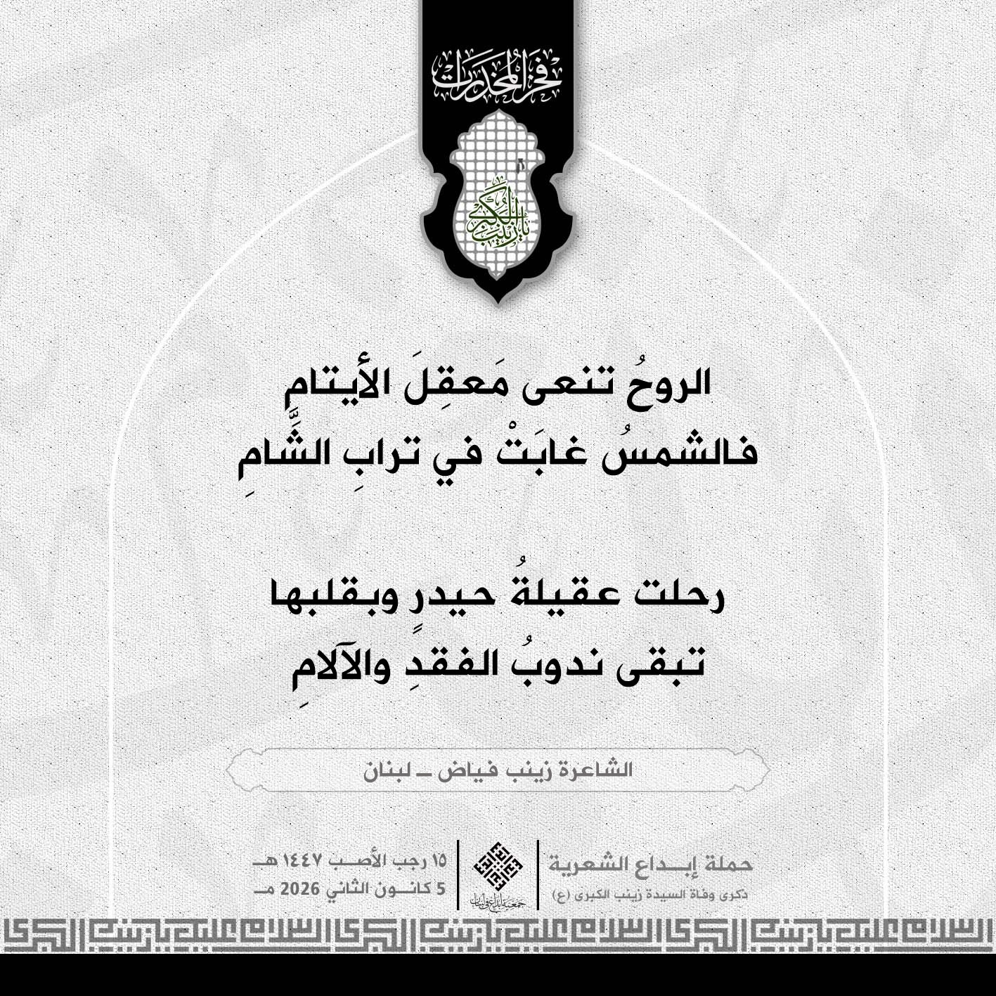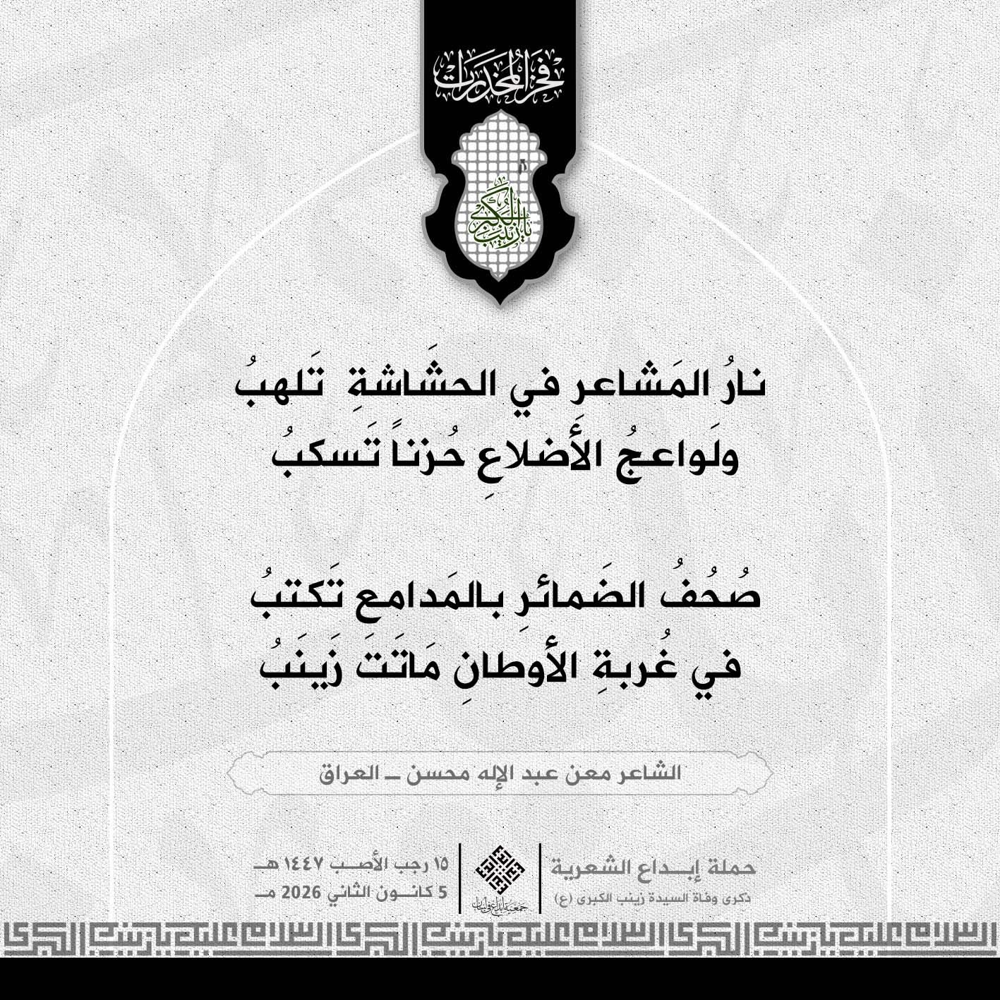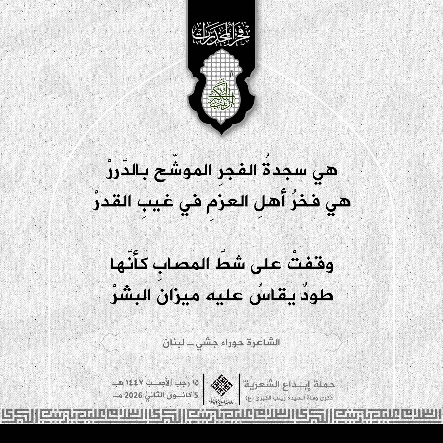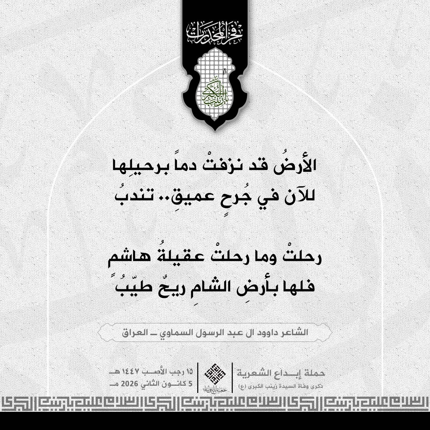 | #فخر_المخدرات | حملة #إبداع الشعرية | في ذكرى وفاة عقيلة بني هاشم السيدة #زينب_الكبرى (ع) | #رجب_15 1447 هـ/ 2026 | المشاركون في الحملة : 1. الشاعر السيد الحتاني ـ لبنان 2. الشاعر حسن علي مهنا ـ لبنان 3. الشاعر داوود ال عبد الرسول السماوي ـ العراق 4. الشاعر رسول باقر ـ العراق 5. الشاعر علي درويش ـ لبنان 6. الشاعر فؤاد الراشدي ـ اليمن 7. الشاعر محمود شور ـ لبنان 8. الشاعر معن عبد الإله محسن ـ العراق 9. الشاعر مهدي البزّال ـ لبنان 10. الشاعر وسيم مهنا ـ لبنان 11. الشاعرة إسراء لافي عودة ـ لبنان 12. الشاعرة حوراء جشي ـ لبنان 13. الشاعرة حوراء حميّة ـ لبنان 14. الشاعرة زينب الموسوي ـ لبنان 15. الشاعرة زينب فياض ـ لبنان 16. الشاعرة سكينة سويدان ـ لبنان 17. الشاعرة عزيزة جميل ـ لبنان 18. الشاعرة غدير نعيم ـ لبنان 19. الشاعرة فاطمة السحمراني ـ لبنان 20. الشاعرة مريم عصمان ـ لبنان 21. الشاعرة منال بجيجي ـ لبنان 22. الشاعرة ناديا الحقاني ـ لبنان 23. الشاعرة نبال رعد ـ لبنان 24. الشاعرة هناء إبراهيم ـ لبنان #فخر_المخدرات #وفاة_زينب_الكبرى #إبداع 5/1/2026 .....