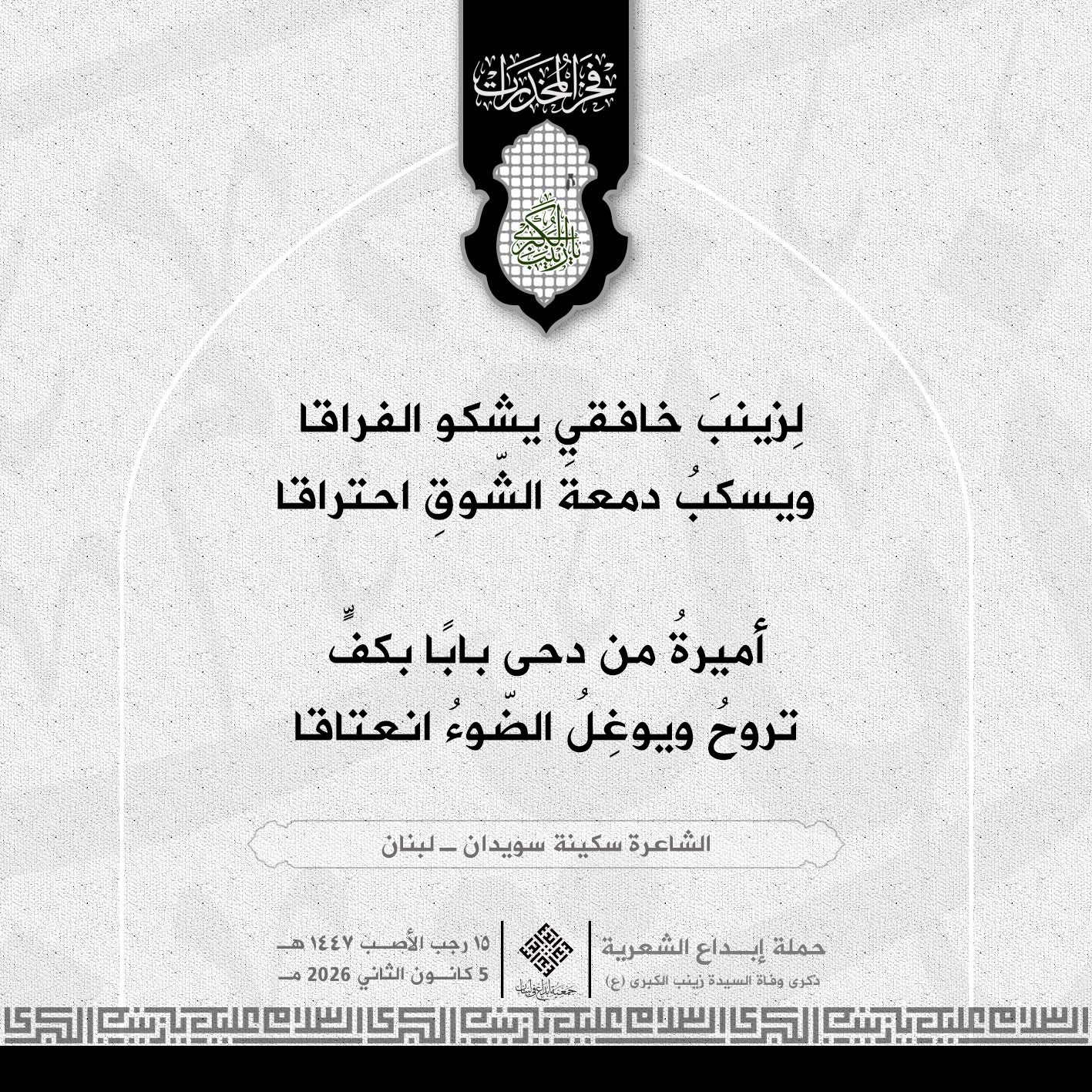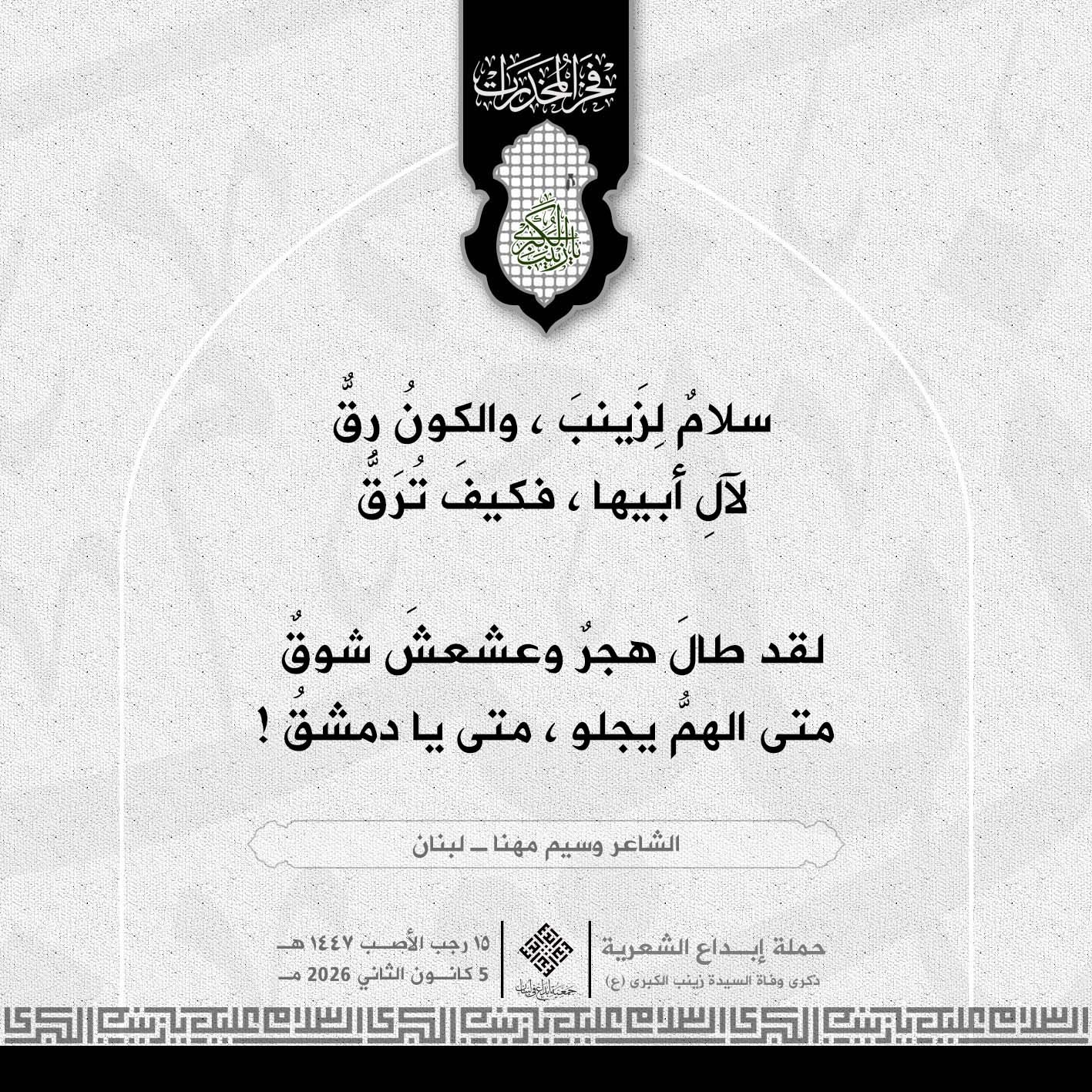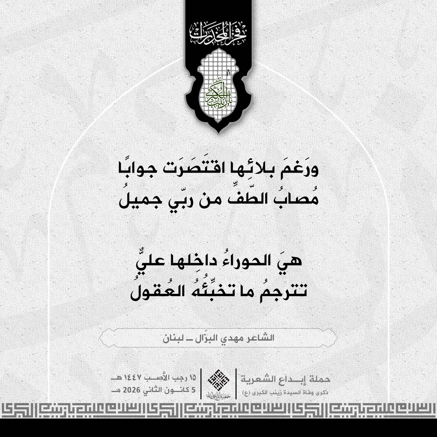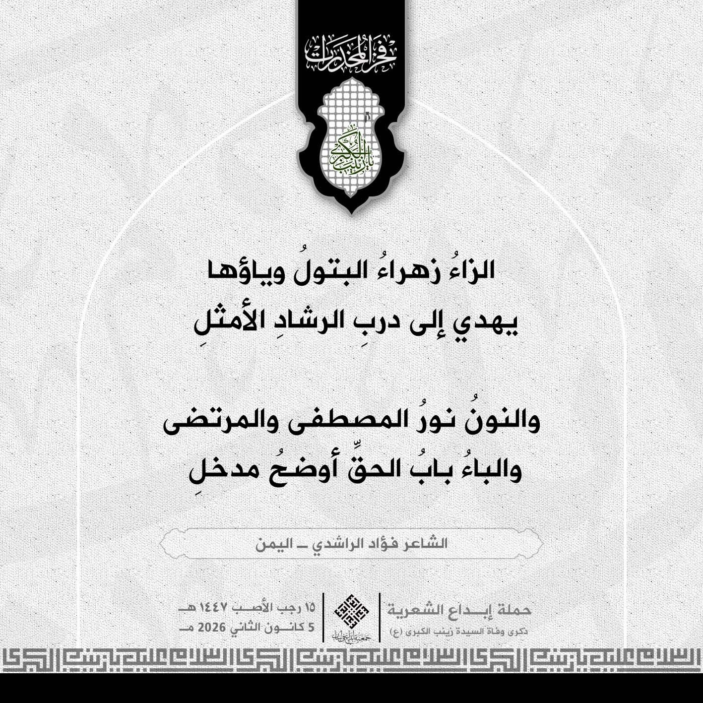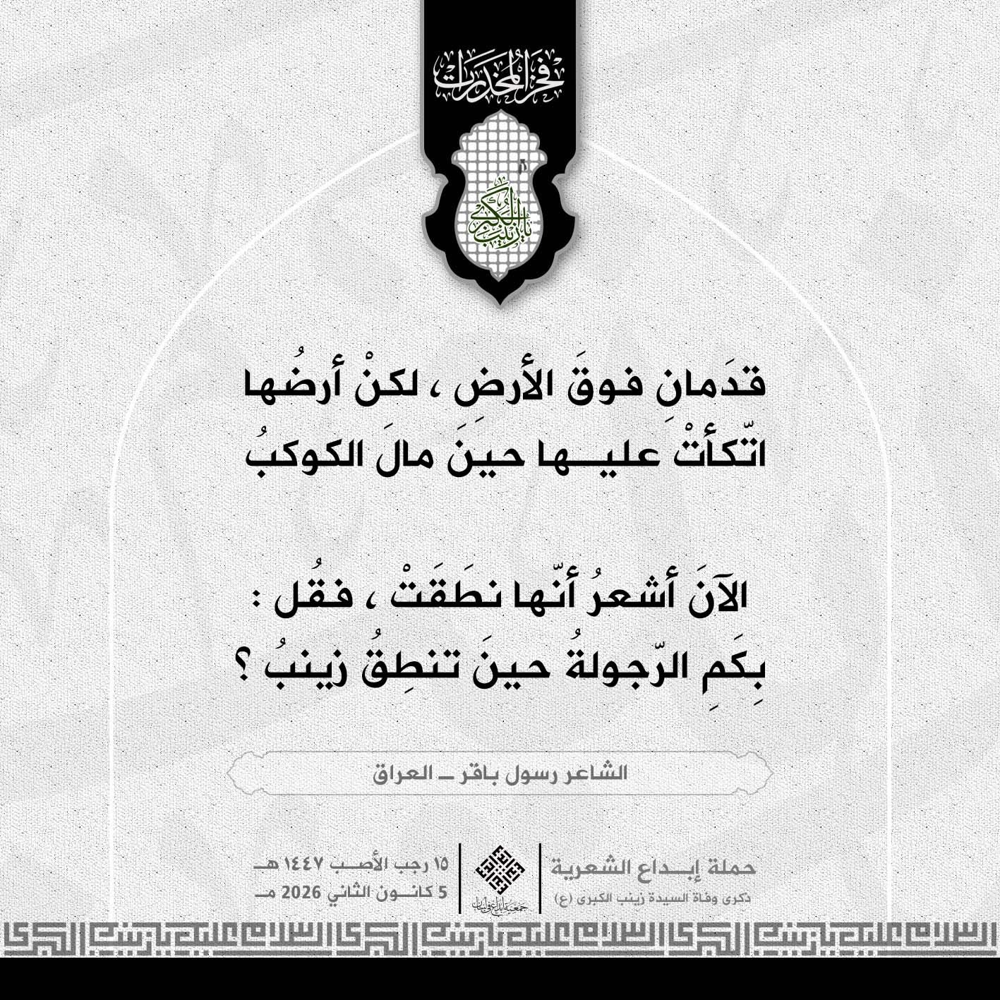 | #فخر_المخدرات | حملة #إبداع الشعرية | في ذكرى وفاة عقيلة بني هاشم السيدة #زينب_الكبرى (ع) | #رجب_15 1447 هـ/ 2026 | المشاركون في الحملة : 1. الشاعر السيد الحتاني ـ لبنان 2. الشاعر حسن علي مهنا ـ لبنان 3. الشاعر داوود ال عبد الرسول السماوي ـ العراق 4. الشاعر رسول باقر ـ العراق 5. الشاعر علي درويش ـ لبنان 6. الشاعر فؤاد الراشدي ـ اليمن 7. الشاعر محمود شور ـ لبنان 8. الشاعر معن عبد الإله محسن ـ العراق 9. الشاعر مهدي البزّال ـ لبنان 10. الشاعر وسيم مهنا ـ لبنان 11. الشاعرة إسراء لافي عودة ـ لبنان 12. الشاعرة حوراء جشي ـ لبنان 13. الشاعرة حوراء حميّة ـ لبنان 14. الشاعرة زينب الموسوي ـ لبنان 15. الشاعرة زينب فياض ـ لبنان 16. الشاعرة سكينة سويدان ـ لبنان 17. الشاعرة عزيزة جميل ـ لبنان 18. الشاعرة غدير نعيم ـ لبنان 19. الشاعرة فاطمة السحمراني ـ لبنان 20. الشاعرة مريم عصمان ـ لبنان 21. الشاعرة منال بجيجي ـ لبنان 22. الشاعرة ناديا الحقاني ـ لبنان 23. الشاعرة نبال رعد ـ لبنان 24. الشاعرة هناء إبراهيم ـ لبنان #فخر_المخدرات #وفاة_زينب_الكبرى #إبداع 5/1/2026 .....