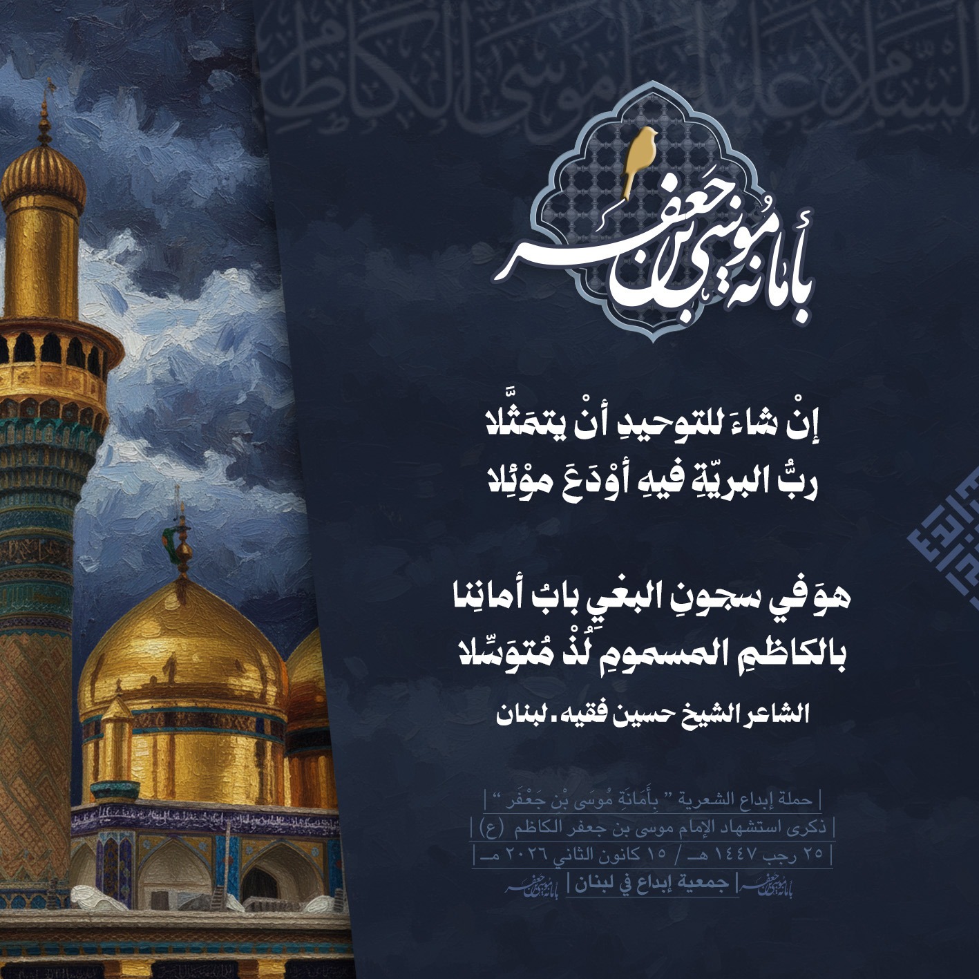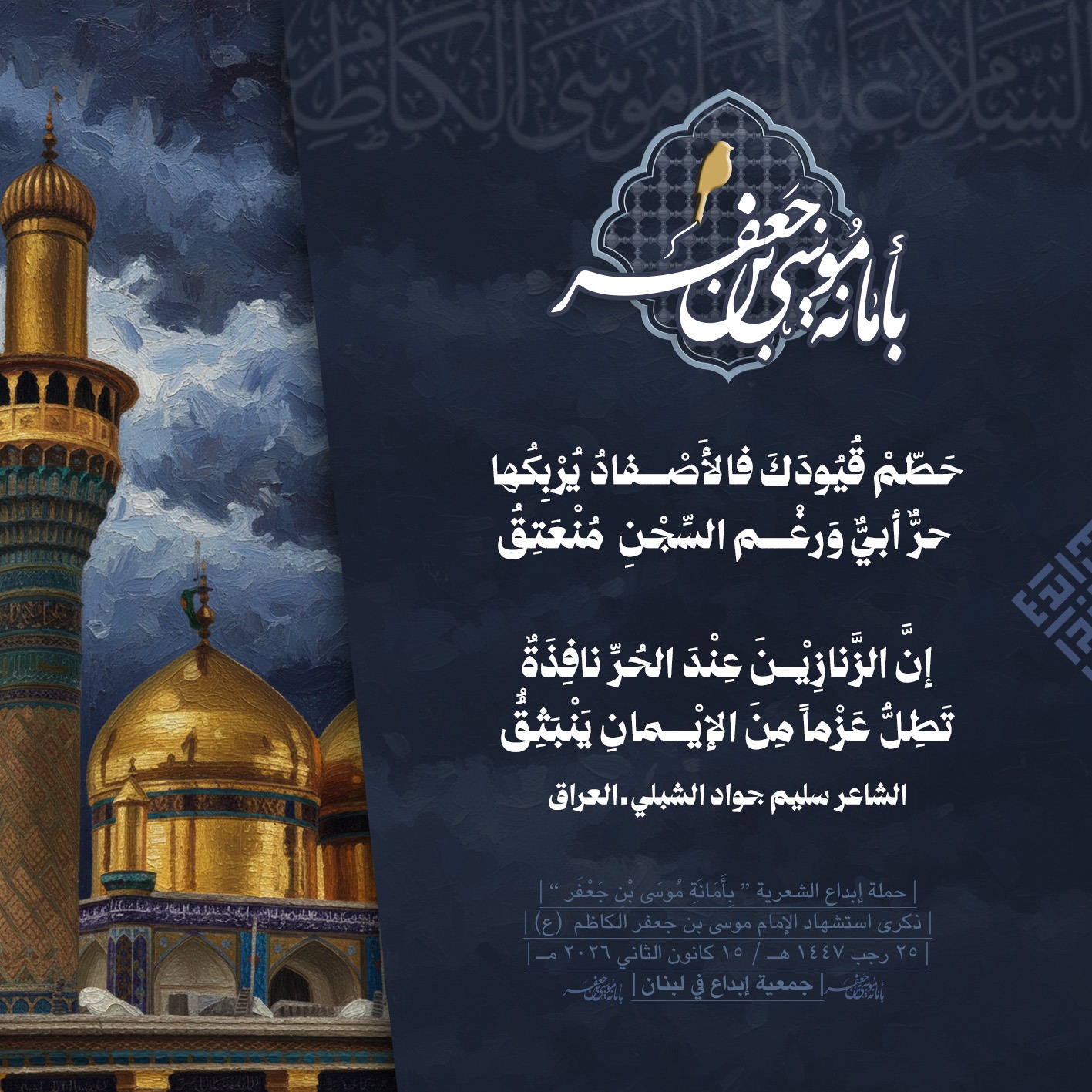 #بأمانة_موسى_بن_جعفر حملة #إبداع الشعرية في ذكرى شهادة الإمام موسى بن جعفر #الكاظم (ع) وفي ظل الهجمة العالمية الاستكبارية على شيعة #آل_محمد (ص) في أوطانهم .. المشاركون في الحملة : 1. الشاعر السيد الحتاني ـ لبنان 2. الشاعر الشيخ حسين فقيه ـ لبنان 3. الشاعر الشيخ سلمان ال عبد الرسول السماوي ـ العراق 4. الشاعر أبو ميرزا مهدي 5. الشاعر حسين آل سهوان ـ القطيف 6. الشاعر داوود ال عبد الرسول السماوي ـ العراق 7. الشاعر رسول باقر ـ العراق 8. الشاعر سليم جواد الشبلي ـ العراق 9. الشاعر علي مرتضى السندي ـ العراق 10. الشاعر فؤاد الراشدي ـ اليمن 11. الشاعر محمد علي محمد مهدي السماوي ـ العراق 12. الشاعر محمود شور ـ لبنان 13. الشاعر معن عبد الإله محسن ـ العراق 14. الشاعر مهدي البزّال ـ لبنان 15. الشاعرة أمل سرور ـ لبنان 16. الشاعرة زينب الموسوي ـ لبنان 17. الشاعرة زينب فياض ـ لبنان 18. الشاعرة سارة اليتامى ـ لبنان 19. الشاعرة غدير أمين ـ لبنان 20. الشاعرة غدير نعيم ـ لبنان 21. الشاعرة فاطمة نظير آل هاني ـ القطيف 22. الشاعرة منال بجيجي ـ لبنان 23. الشاعرة ناديا الحقاني ـ لبنان 24. الشاعرة نبال رعد ـ لبنان 25. الشاعرة نور مصطفى لمع ـ لبنان 26. الشاعرة هناء إبراهيم ـ لبنان #إبداع #بأمانة_موسى_بن_جعفر #استشهاد_الكاظم 15/1/2026 ..... .jpeg)