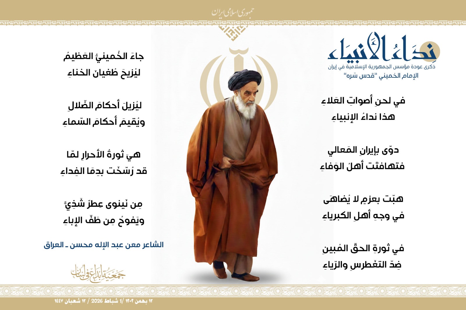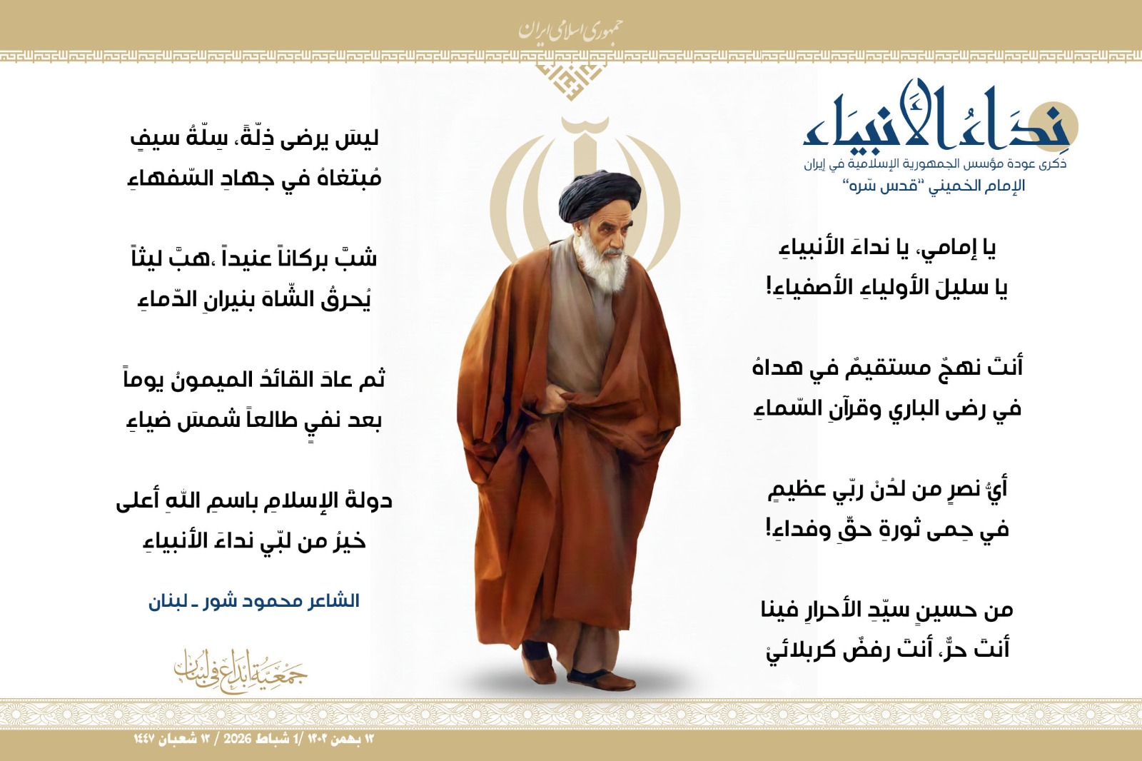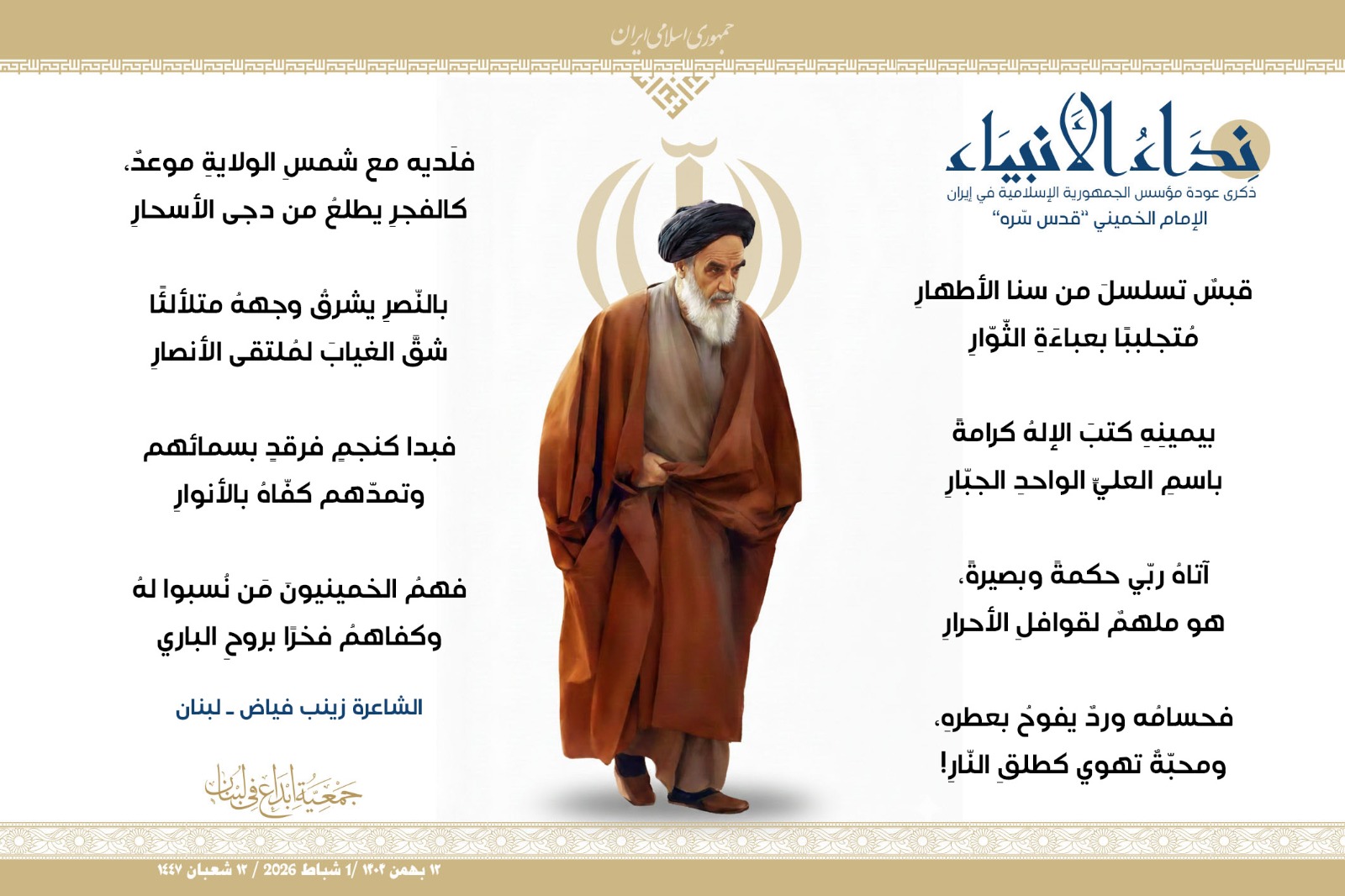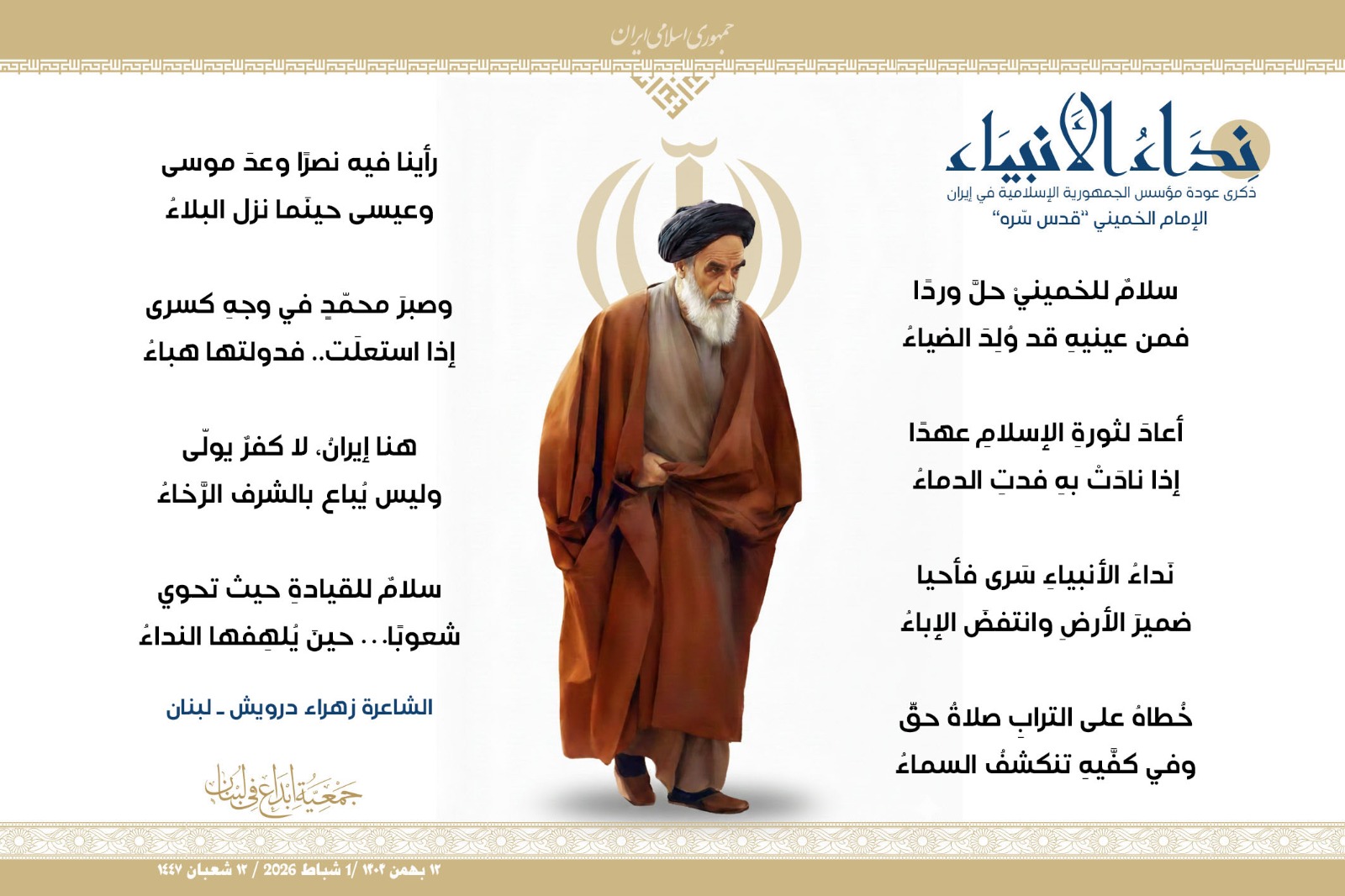 #نداء_الأنبياء #نداء_الأنبياء حملة #إبداع الشعرية في ذكرى عودة الإمام الخميني الراحل إلى #إيران وبداية #عشرة_الفجر لانتصار الثورة الإسلامية في إيران .. شارك في الحملة كل من : 1. الشاعر داوود ال عبد الرسول السماوي ـ العراق 2. الشاعر علي درويش ـ لبنان 3. الشاعر فؤاد الراشدي ـ اليمن 4. الشاعر محمود شور ـ لبنان 5. الشاعر معن عبد الإله محسن ـ العراق 6. الشاعر مهدي البزّال ـ لبنان 7. الشاعرة زهراء درويش ـ لبنان 8. الشاعرة زينب الموسوي ـ لبنان 9. الشاعرة زينب فياض ـ لبنان 10. الشاعرة مريم عصمان ـ لبنان 11. الشاعرة ناديا الحقاني ـ لبنان 12. الشاعرة هناء إبراهيم ـ لبنان #إبداع #نداء_الأنبياء #عودة_الإمام #إيران أول شباط 2026 ......