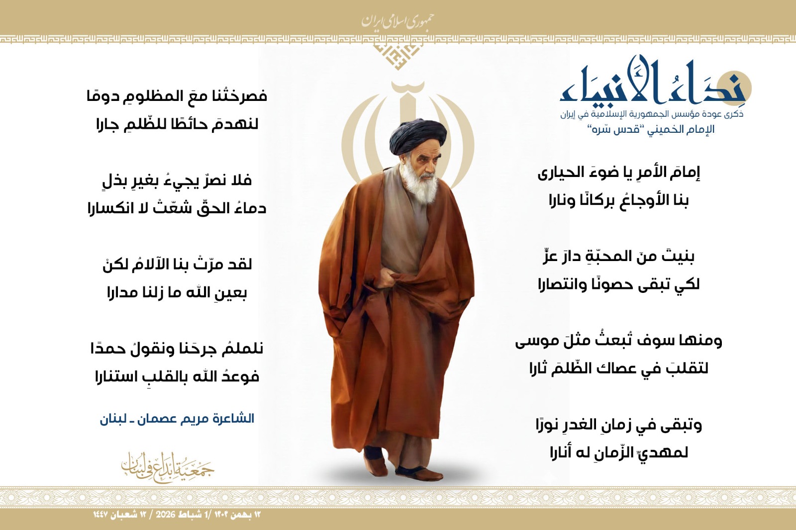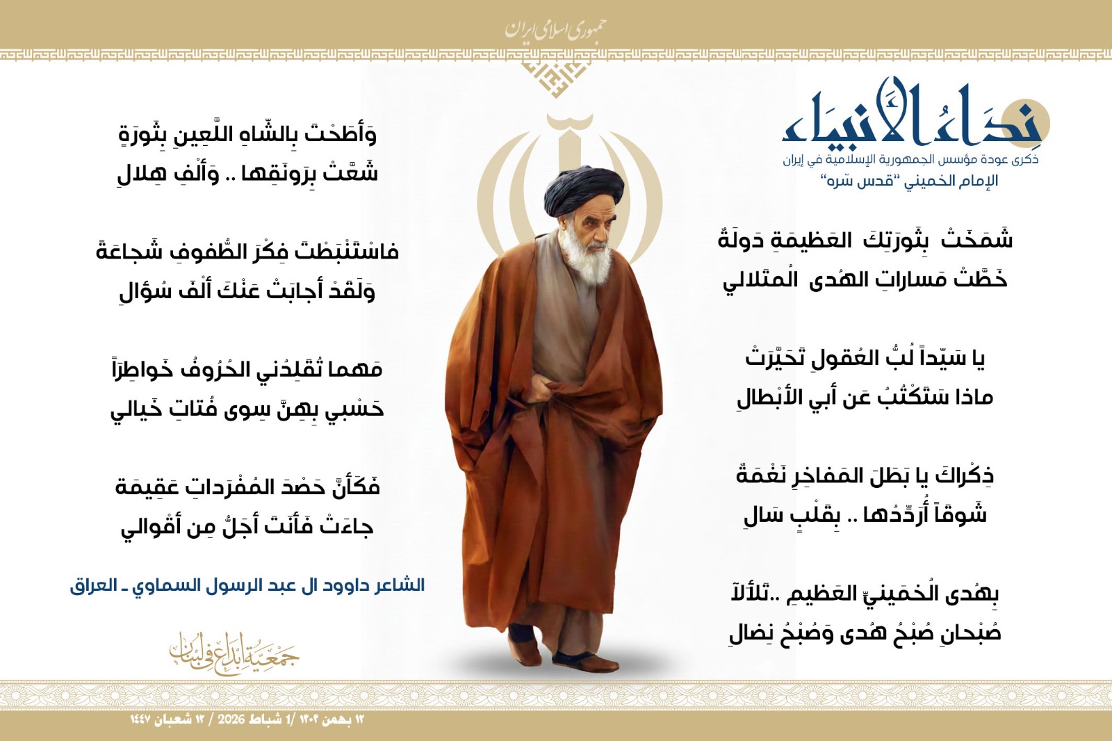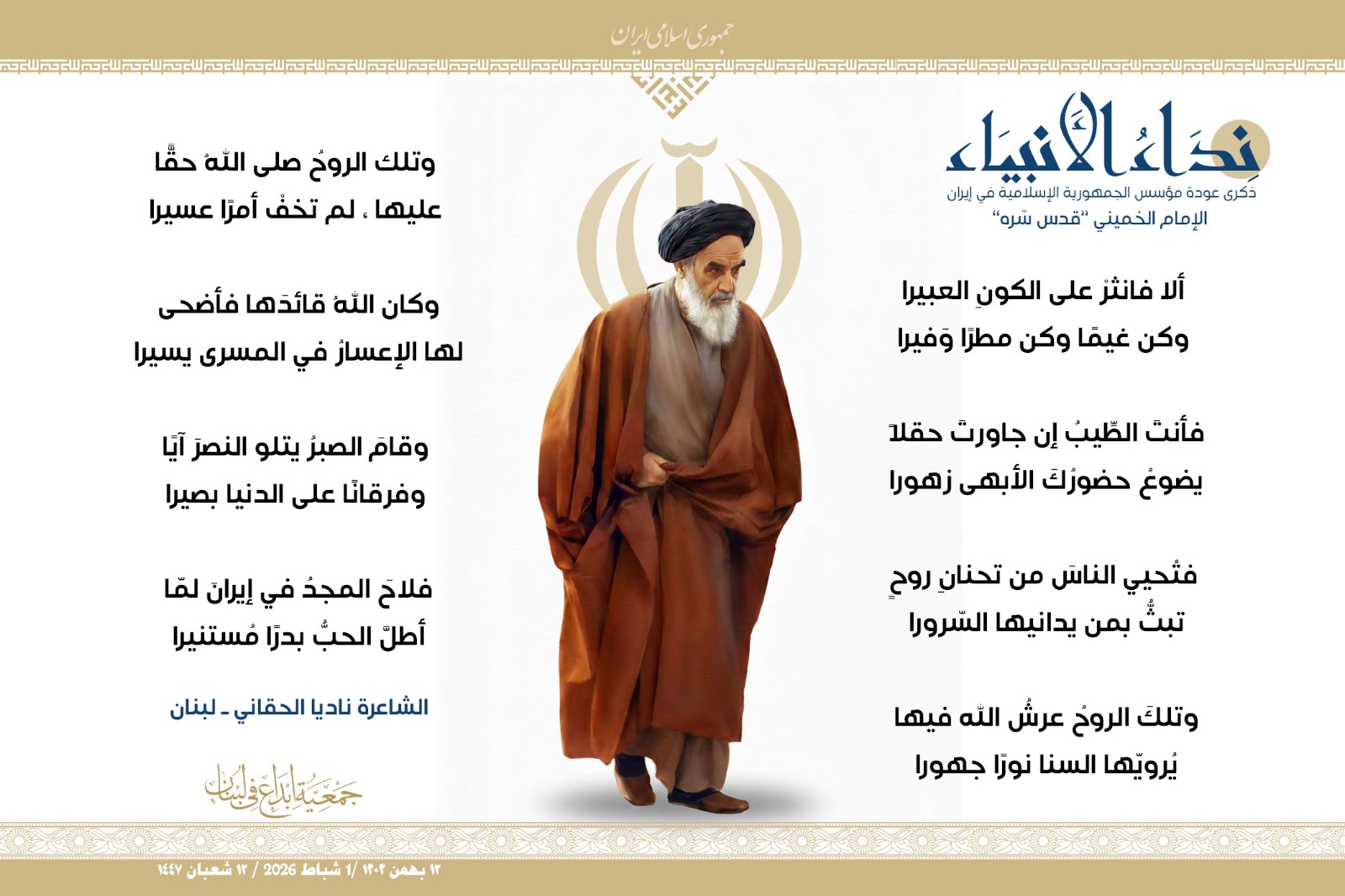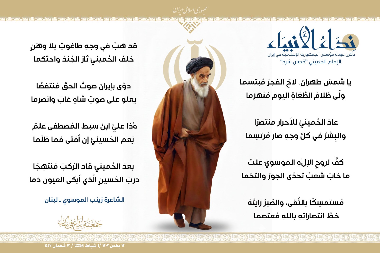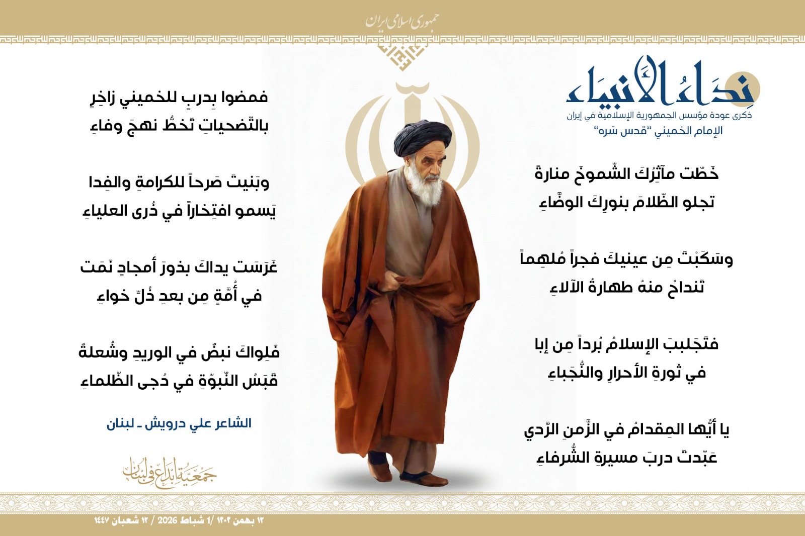 #نداء_الأنبياء #نداء_الأنبياء حملة #إبداع الشعرية في ذكرى عودة الإمام الخميني الراحل إلى #إيران وبداية #عشرة_الفجر لانتصار الثورة الإسلامية في إيران .. شارك في الحملة كل من : 1. الشاعر داوود ال عبد الرسول السماوي ـ العراق 2. الشاعر علي درويش ـ لبنان 3. الشاعر فؤاد الراشدي ـ اليمن 4. الشاعر محمود شور ـ لبنان 5. الشاعر معن عبد الإله محسن ـ العراق 6. الشاعر مهدي البزّال ـ لبنان 7. الشاعرة زهراء درويش ـ لبنان 8. الشاعرة زينب الموسوي ـ لبنان 9. الشاعرة زينب فياض ـ لبنان 10. الشاعرة مريم عصمان ـ لبنان 11. الشاعرة ناديا الحقاني ـ لبنان 12. الشاعرة هناء إبراهيم ـ لبنان #إبداع #نداء_الأنبياء #عودة_الإمام #إيران أول شباط 2026 ......
