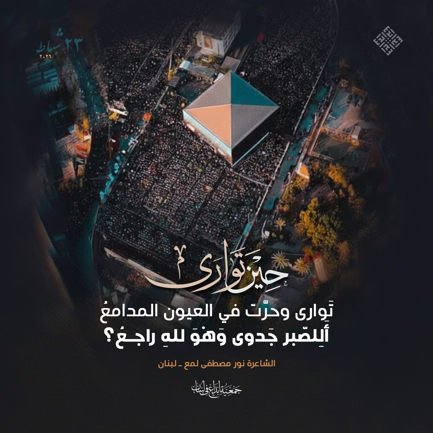 #حين_توارى حملة #إبداع الشعرية بذكرى تشييع مولانا #السيد #المستطاب #سيد_شهداء_الأمة المشاركون في الحملة : 1. الشاعر الشيخ حسين فقيه ـ لبنان 2. الشاعر الشيخ سلمان ال عبد الرسول السماوي ـ العراق 3. الشاعر أبو ميرزا مهدي 4. الشاعر أحمد علي أحمد ـ لبنان 5. الشاعر أحمد غالب سرحان ـ لبنان 6. الشاعر جواد حايك ـ لبنان 7. الشاعر حسن سامي العبد الله ـ العراق 8. الشاعر حسين صفوان ـ لبنان 9. الشاعر داوود ال عبد الرسول السماوي ـ العراق 10. الشاعر زكريا المنخي ـ العراق 11. الشاعر ضياء عاشور ـ العراق 12. الشاعر عبد الله خليفة ـ لبنان 13. الشاعر علي أسامة الحاج دياب ـ لبنان 14. الشاعر علي درويش ـ لبنان 15. الشاعر علي مرتضى السندي ـ العراق 16. الشاعر محمود شور ـ لبنان 17. الشاعر معن عبد الإله محسن ـ العراق 18. الشاعر مهدي البزّال ـ لبنان 19. الشاعر مهدي مصطفى عرار ـ لبنان 20. الشاعرة إسراء شبلي ـ لبنان 21. الشاعرة إسراء لافي عودة ـ لبنان 22. الشاعرة أمل سرور ـ لبنان 23. الشاعرة حوراء حميّة ـ لبنان 24. الشاعرة زهراء درويش ـ لبنان 25. الشاعرة زينب الموسوي ـ لبنان 26. الشاعرة سارة اليتامى ـ لبنان 27. الشاعرة سكينة سويدان ـ لبنان 28. الشاعرة غدير نعيم ـ لبنان 29. الشاعرة فاطمة العوطة ـ لبنان 30. الشاعرة فاطمة سكاف ـ لبنان 31. الشاعرة كوثر العطار ـ لبنان 32. الشاعرة كوثر حجازي ـ لبنان 33. الشاعرة مريم عبيد ـ لبنان 34. الشاعرة مريم عصمان ـ لبنان 35. الشاعرة منال بجيجي ـ لبنان 36. الشاعرة ميسم مغنية ـ لبنان 37. الشاعرة ناديا الحقاني ـ لبنان 38. الشاعرة نبال رعد ـ لبنان 39. الشاعرة نور مصطفى لمع ـ لبنان 40. الشاعرة هناء إبراهيم ـ لبنان ... #إبداع #حين_توارى 23 شباط 2026 #تشييع_السيد